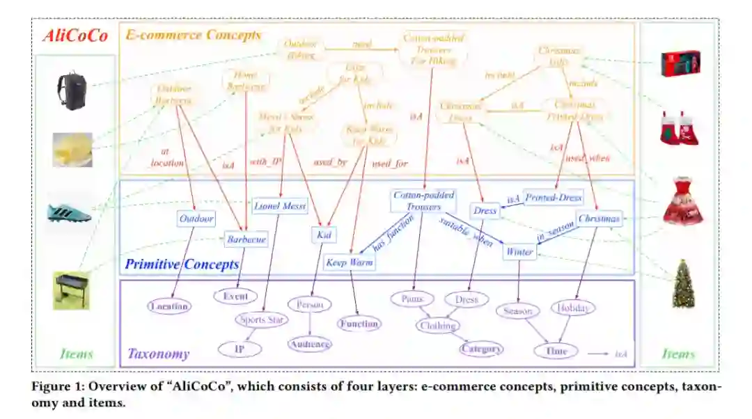 电子商务平台的终极目标之一就是满足客户的各种购物需求。为了实现这一目标,电子商务中的许多工作都致力于创建分类法或本体。然而,电子商务中的用户需求仍然没有得到很好的定义,现有的本体都没有足够的深度和广度来理解普遍的用户需求。语义上的鸿沟阻碍了购物体验的智能化。在本文中,我们提出构建一个大型的电子商务认知概念网“AliCoCo”,并在全球最大的中国电子商务平台阿里巴巴进行实践。我们正式地定义了电子商务中的用户需求,然后将其概念化为网络中的节点。我们将详细介绍AliCoCo是如何半自动构建的,以及它在电子商务中的成功、持续和潜在应用。