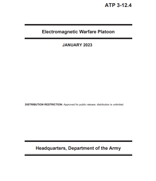 ATP 3-12.4为军团及以下梯队的电磁战排提供技术。该出版物提供了条令指导;描述了排内的关系;定义了组织角色、职能、能力和限制;并确定了电磁战排在军队行动中的责任。