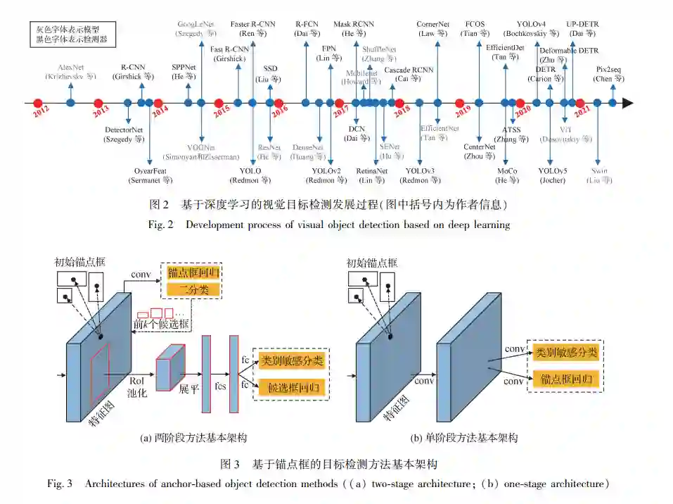 在过去的几十年中,目标检测经历了基于手工 设计特征的方法到基于深度特征的方法等不同发展 阶段。 早期,目标检测方法通常采用手工设计特征 加浅层分类器的技术路线,例如支持向量机(support vector machines,SVM) 和 AdaBoost 等,涌现了包括 Haar 特征(Viola 和 Jones,2004)、方向梯度直方图 (histograms of oriented gradients,HOG) 特征( Dalal 和 Triggs,2005)等一系列经典的目标检测特征描述 子。 2012 年以来,深度学习技术取得了飞速的发 展,并行计算资源不断迭代更新,大规模数据库及评 测标准相继构建与公开。 基于上述技术、算力和数 据的铺垫,视觉目标检测开始在精度与效率等方面 取得了显著的进展,先后涌现出区域卷积神经网络 (region-based convolutional neural network,R-CNN) (Girshick 等,2014)、SSD( single shot detector) ( Liu 等,2016)、YOLO( you only look once) (Redmon 等, 2016)、 DETR ( detection transformer ) ( Carion 等, 2020)等一系列经典的研究工作。 相比于传统手工 设计特征的方法,基于深度学习的方法避免了烦琐 的手工设计过程,能够自动学习更具有区分力的深 度特征。 与此同时,基于深度学习的方法将特征提 取和分类器学习统一在一个框架中,能够进行端到 端的学习。