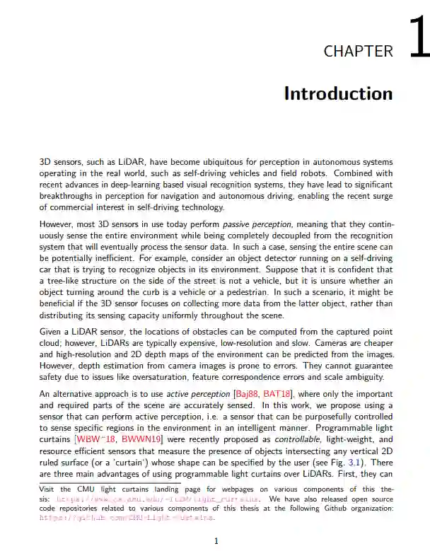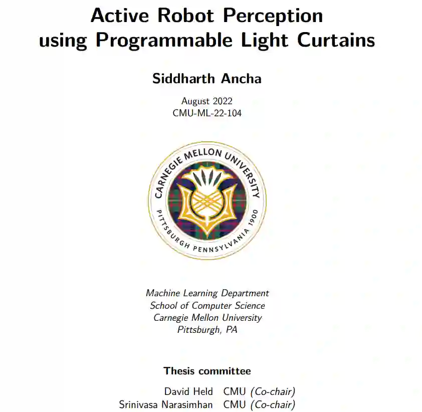 大多数用于机器人感知的3D传感器,如激光雷达,被动扫描整个环境,同时与处理传感器数据的感知系统解耦。相比之下,主动感知是机器人的另一种范式,在这种范式中,可控传感器只自适应地将其感知能力集中在环境中最有用的区域。可编程光幕是最近发明的一种资源高效的主动传感器,可以测量任何用户指定的表面(“窗帘”)的深度,分辨率比激光雷达高得多。主要的研究挑战是设计感知算法来决定光幕在每个时间步的位置,在闭环中紧密耦合感知和控制。