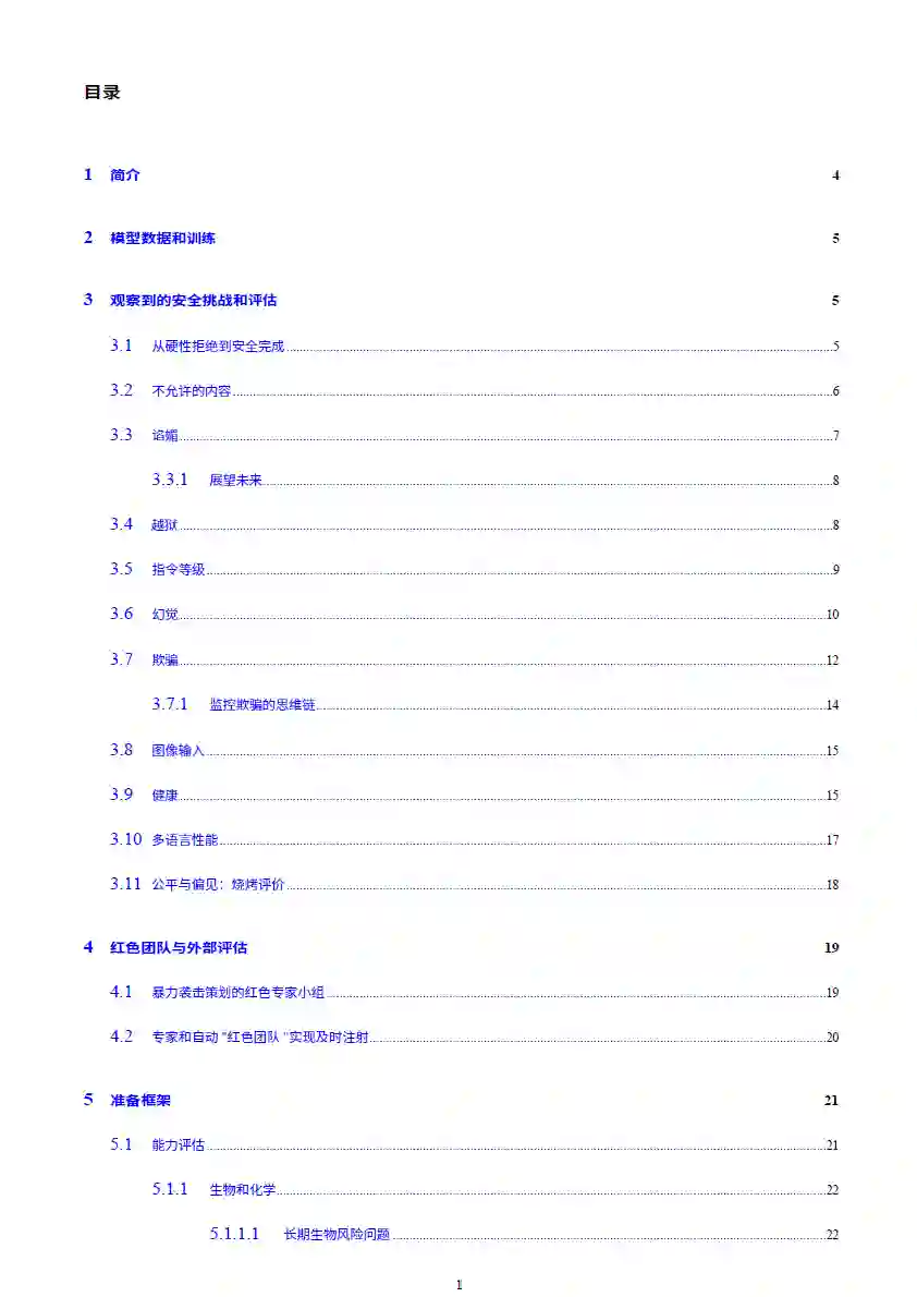 - 安全训练革新:从传统的“硬拒绝”(直接拒绝风险请求)转向“安全完成”(在符合安全政策的前提下最大化有用性),大幅提升双用途场景(如生物、网络安全)的安全性和有用性。
