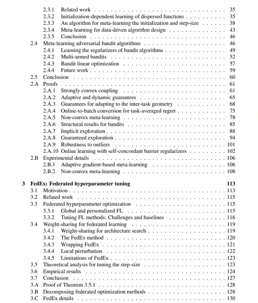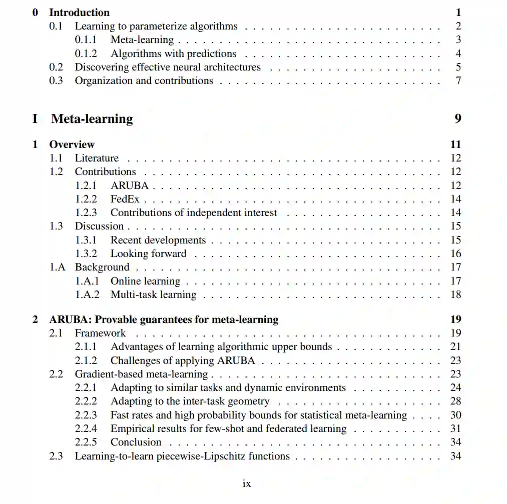 在元学习中,我们利用机器学习自身来改善 ML 算法,通过跨多个学习任务进行学习,我们引入了 ARUBA,一个用于设计和分析元学习方法的框架。我们的分析提供了基于梯度的元学习的首次保证,展示了这些方法如何根据可量化的学习任务相似性指标提高性能。我们利用 ARUBA 将元学习的实际影响扩展到机器学习的新领域,包括部分反馈学习和联邦学习;在后者中,我们引入了 FedEx,一种用于调优联邦优化器的新型最先进方法,该优化器在分布式异构数据集(如移动设备和医院记录)网络上训练模型。