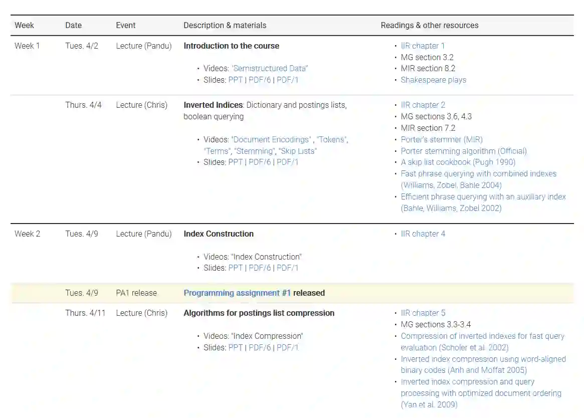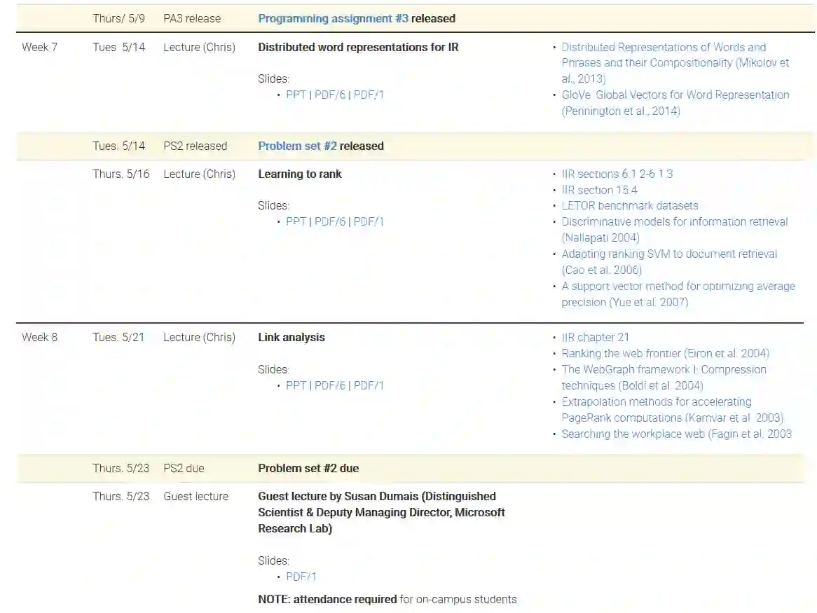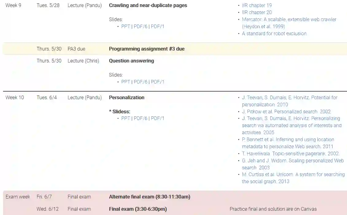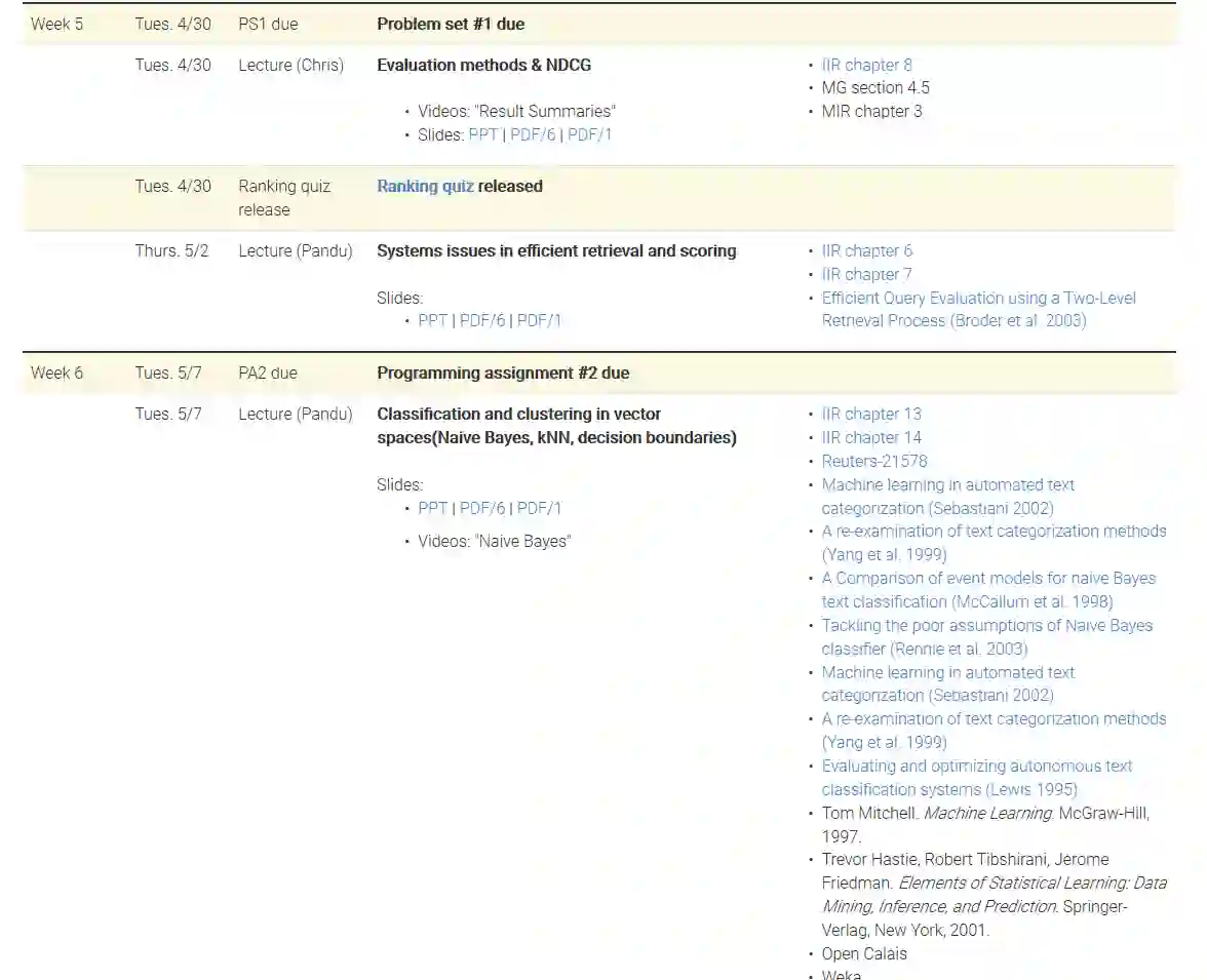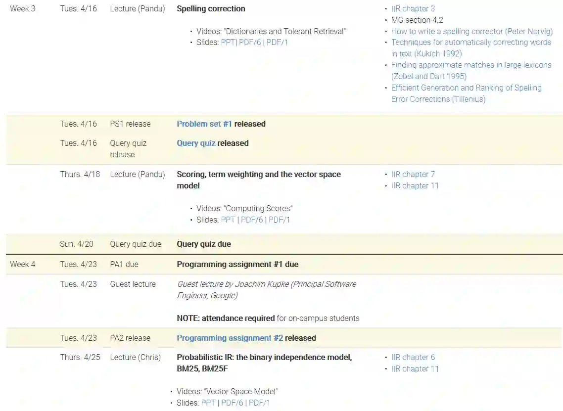 课程名称: CS276: Information Retrieval and Web Search(Spring quarter 2019