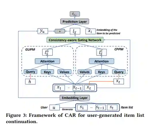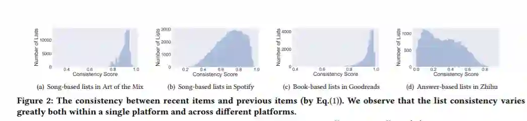 用户生成的项目列表在许多平台上都很流行。例如,YouTube上的视频播放列表、Pinterest上的图片列表、Goodreads上的基于书籍的列表,以及知乎等问答论坛上的基于答案的列表。在用户创建这些列表时,一个常见的挑战是确定接下来要管理哪些项目。一些列表是围绕特定的类型或主题组织的,而另一些似乎是不连贯的,反映了个人对哪些项目属于一起的偏好。此外,项目一致性的异质性可能因平台而异,也可能因子社区而异。为此,本文提出了一种可推广的用户生成项列表的方法。作为利用特定内容模式(例如,基于歌曲的播放列表依赖于音频特性)的方法的补充,所提出的方法基于人工管理模式对项列表的一致性建模,因此可以跨各种不同的项类型(例如,视频、图像、书籍)进行部署。一个关键的贡献是通过一个新的一致性感知门控网络智能地组合两个偏好模型:—个捕获用户总体兴趣的通用用户偏好模型和一个捕获用户当前兴趣(作为最近的项目)的当前偏好优先级模型。这样,所提出的一致性感知推荐器可以随着用户偏好的变化而动态调整。对四个数据集(歌曲、书籍和答案)的评估证实了这些观察,并证明了所提出的模型与最先进的替代方案的有效性。