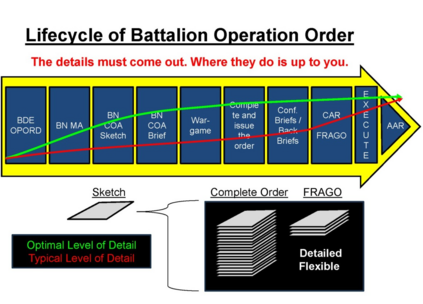 规划的核心目标是将单页行动方案(CoA)草图发展为完整作战命令。成功阈值取决于细节把控:若命令缺失关键细节,指挥官只能临机处置或面临任务失败。早期发现漏洞(如CoA简报阶段)尚可补救,但随着流程推进修正难度递增——确认简报阶段的尖锐问题虽棘手但可修正,预演阶段在沙盘上被质问计划漏洞虽尴尬仍能发布补充命令(FRAGO),而执行阶段发现疏漏需付出更大代价,某些深层缺陷甚至需待O/C/T引导的战后讲评(AAR)才能暴露。图1以绿线表示理想细节层级,红线显示典型细节缺口,直观呈现命令生命周期的细节管理曲线。