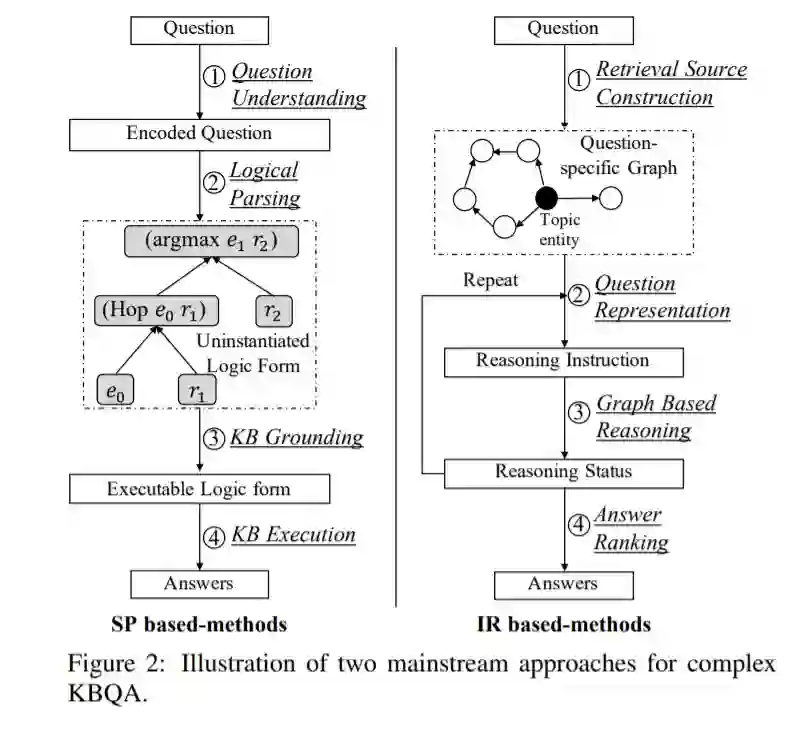 知识库问答旨在通过知识库回答自然语言问题。近来,大量的研究集中在语义或句法上复杂的问题上。在本文中,我们精心总结了复杂知识库问答任务的典型挑战和解决方案,介绍了复杂知识库问答的两种主流方法,即基于语义解析(基于SP)的方法和基于信息检索(基于IR)的方法。首先,我们形式化地定义了知识库问答任务并介绍了该任务下相关的数据集。然后,我们从两个类别的角度全面回顾了前沿方法,说明他们针对典型挑战的解决方案。最后,我们总结并讨论了一些仍具有挑战的未来研究方向。