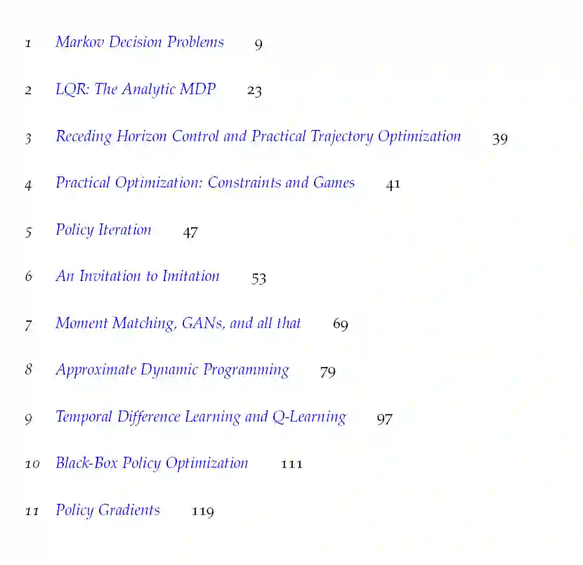 这本书是对卡内基梅隆大学Drew Bagnell在自适应控制和强化学习课程(2010,11,14),Byron Boots在佐治亚理工大学(2019)和Sanjiban Choudhury在康奈尔大学(2022)所做课堂笔记的编辑合集。我们感谢Chris Atkeson共同讲授了这门课的第一个实例,并塑造了我们在这里思考问题的方式。这本书——以及它所依据的类——旨在提供一套实用工具,为机器与世界的交互构建决策程序。我们的应用程序从视频游戏和网络搜索到机器人操作和自动驾驶汽车。这个领域是广阔的,所以我们的观点必然是狭隘的。我们明确地不做严格的尝试,而是专注于直觉和建立这种直觉的非正式数学论证,以及我们在艰难的决策问题上多次看到的技术。我们试图概括出我们在实践中最有可能采用的技术和思维方式。在整个过程中,我们试图指出严格的衍生和原始文献的主题。这些笔记的设计基于概率的基本技术(条件概率、条件独立、高斯、积分技术、贝叶斯方法和推断、滤波和时间序列模型)、线性代数(计算和基本线性分析)、优化(梯度、Hessians、度量、Krylov子空间)和机器学习(泛化、优化、无后悔/在线学习、反向传播和核方法)。