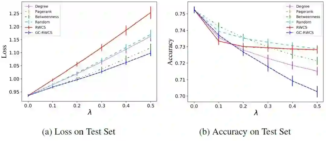 原文:https://arxiv.org/abs/2006.05057本文在黑盒的基础上采取了更加现实的设定:攻击节点的度和数量都有所限制(对于社交网络,不能攻击名人节点),而且无法获取模型预测。本文主要关注攻击节点的选取。白盒攻击常采取的目标函数Carlini-Wagner Loss为其中为最后一层节点表示,即预测矩阵。该损失函数含义为,每个节点预测的最大置信度与真实标签对应的置信度之差的和。损失函数越大,说明模型的预测中,错误结果与真实结果相去甚远,因此攻击效果越好。作者证明了使用该损失函数时,某个节点的扰动带来的损失函数变化的一阶近似期望与图随机游走矩阵该列之和相关。因此,可以选取随机游走矩阵列求和最大的几个节点进行攻击,即RWCS方法。实验结果表明,随着扰动强度的增加,损失函数线性增大,但是分类正确率在扰动强度达到一定值之后不再减小。这说明Loss和ACC之间存在不匹配的关系。这种不匹配关系暗示了攻击的冗余特性。