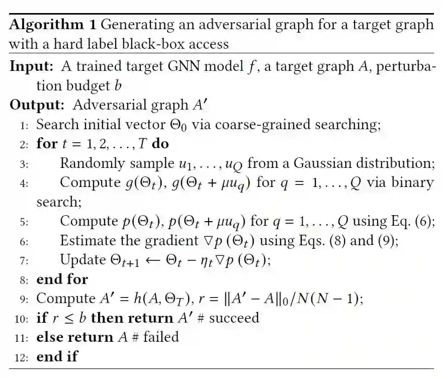 本文是硬标签的设定,即攻击者只知道模型预测的one-hot结果而非置信度。并且,作者发现图攻击的复杂度会随着节点数量的增加而指数级增加,因此首先将邻接矩阵连续化(这也是很多基于优化的图攻击的做法)。其中为扰动函数,为扰动矩阵。由于本文是图分类攻击模型,因此优化问题可以表示为定义图结构沿着扰动到分类边界的距离为,因此我们需要的最小的扰动的个数为。我们的目标就是选取让最小的,为了优化,实际中使用1范数替代0范数。算法如下