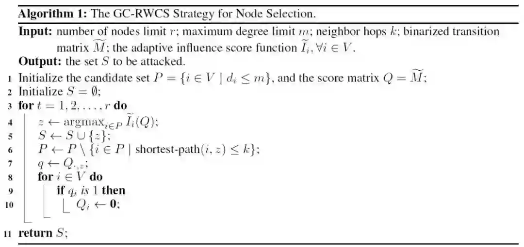 其中为二值化的随机游走矩阵为评分函数,,对的列求和。这个算法做了如下几个改进:第6行每次迭代去掉选中节点跳邻居,因为攻击具有同配性(邻居节点对攻击的贡献与节点本身类似);第7至10行,更新某些特定行的值,因为代表攻击很可能会让分类错误,因此更新矩阵第行为0,让不再对攻击节点选取有贡献。