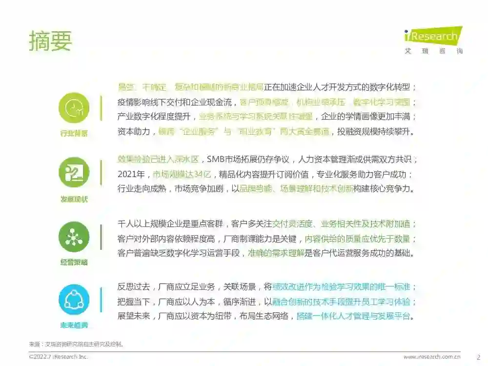 效果检验已进入深水区,SMB市场拓展仍存争议,人力资本管理渐成供需双方共识;2021年,市场规模达34亿,精品化内容提升订阅价值,专业化服务助力客户成功;行业走向成熟,市场竞争加剧,以品牌势能、场景理解和技术创新构建核心竞争力。