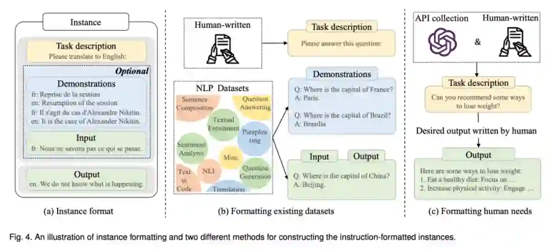 LLMs 的适应性调优经过预训练,LLMs 可以获得解决各种任务的通用能力。然而越来越多的研究表明,LLMs 的能力可以根据具体目标进一步调整。在第五节中,研究者详细介绍了调整预训练 LLMs 的两个主要方法,即指令调优(instruction tuning)和对齐调优(alignment tuning)。前一种方法主要是为了提高或解锁 LLMs 的能力,而后一种方法则是为了使 LLMs 的行为与人类的价值观或偏好一致。指令调优本质上,指令调优是在自然语言形式的格式化实例集合上微调预训练 LLMs 的方法,这与监督微调和多任务提示训练高度相关。为了执行指令调优,我们首先需要收集或构建指令格式的实例。然后,我们通常使用这些格式化实例以监督学习方式微调 LLMs(例如,使用序列到序列损失进行训练)。在指令调整后,LLMs 可以展示出卓越的能力,泛化出能解决未见任务的能力,即使在多语言环境中也是如此。最近的一项调查对指令调优研究进行了系统的概述。相比之下,本文主要关注指令调优对 LLMs 的影响,并提供实例收集和调优的详细指南或策略。此外,本文还讨论了使用指令调优来满足用户的实际需求,这已广泛应用于现有的 LLMs,例如 InstructGPT 和 GPT-4。格式化实例构建:通常,指令格式的实例由任务描述(称为指令)、输入输出对和少量演示(可选)组成。作为重要的公共资源,现有研究已经发布了大量以自然语言格式化的标记数据(参见表 5 中的可用资源列表)。接下来,本文将介绍构造格式化实例的两种主要方法(参见图 4 中的插图),然后讨论实例构造的几个关键因素。指令调优策略:与预训练不同,指令调优通常更有效,因为只有适度数量的实例用于训练。虽然指令调优可以被认为是一个有监督的训练过程,但它的优化在几个方面与预训练不同,例如训练目标(即序列到序列损失)和优化配置(例如更小的批次) 大小和学习率),这在实践中需要特别注意。除了这些优化配置之外,指令调优还需要考虑两个重要方面: