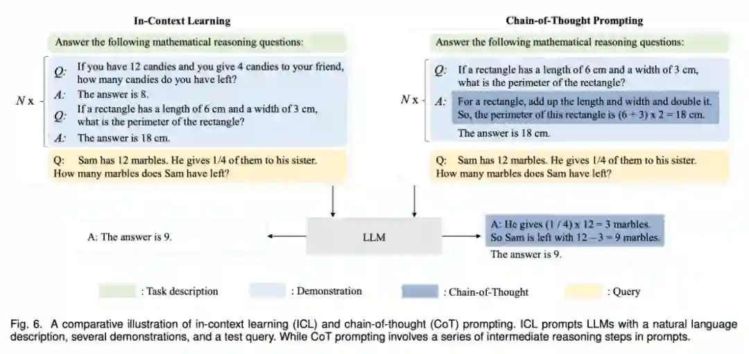 LLMs 的涌现能力LLM 的涌现能力被正式定义为「在小型模型中不存在但在大型模型中出现的能力」,这是 LLM 与以前的 PLM 区分开来的最显著特征之一。当出现这种新的能力时,它还引入了一个显著的特征:当规模达到一定水平时,性能显著高于随机的状态。以此类推,这种新模式与物理学中的相变现象密切相关。原则上,这种能力也可以与一些复杂的任务有关,而人们更关心可以应用于解决多个任务的通用能力。这里简要介绍了 LLM 的三种代表性的涌现能力:上下文学习。GPT-3 正式引入了上下文学习能力:假设语言模型已经提供了自然语言指令和多个任务描述,它可以通过完成输入文本的词序列来生成测试实例的预期输出,而无需额外的训练或梯度更新。指令遵循。通过对自然语言描述(即指令)格式化的多任务数据集的混合进行微调,LLM 在微小的任务上表现良好,这些任务也以指令的形式所描述。这种能力下,指令调优使 LLM 能够在不使用显式样本的情况下通过理解任务指令来执行新任务,这可以大大提高泛化能力。循序渐进的推理。对于小语言模型,通常很难解决涉及多个推理步骤的复杂任务,例如数学学科单词问题。同时,通过思维链推理策略,LLM 可以通过利用涉及中间推理步骤的 prompt 机制来解决此类任务得出最终答案。据推测,这种能力可能是通过代码训练获得的。