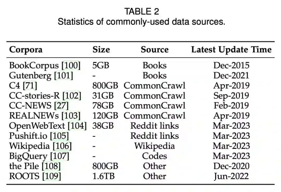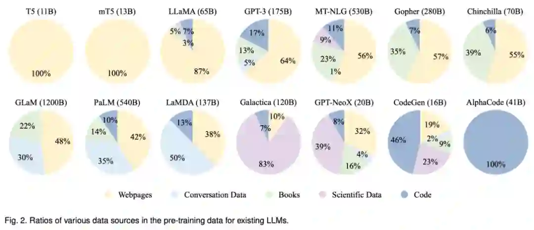 预训练建立了 LLMs 的能力基础。通过对大规模语料库的预训练,LLMs 可以获得基本的语言理解和生成技能。在这个过程中,预训练语料库的规模和质量是 LLMs 获得强大能力的关键。此外,为了有效地预训练 LLMs,模型架构、加速方法和优化技术都需要精心设计。在第四节中,研究者首先在第 4.1 节讨论了数据的收集和处理,然后在第 4.2 节介绍了常用的模型架构,最后在第 4.3 节介绍了稳定和有效优化 LLMs 的训练技术。数据收集要开发一个强大的 LLM,从各种数据源中收集大量的自然语言语料至关重要。现有 LLMs 主要利用各种公共文本数据集作为预训练语料库。下图 2 列出了现有 LLMs 的预训练数据源分布。