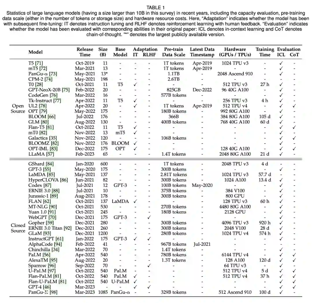 关键技术接下来来看 LLMs 的关键技术,包括了缩放、训练、能力激发、对齐调优、工具利用等。缩放。缩放是增加 LLMs 模型容量的关键因素,最开始 GPT-3 将模型参数增至 1750 亿,随后 PaLM 进一步将模型参数增至 5400 亿。大规模参数对于涌现能力至关重要。缩放不仅针对模型大小,还与数据大小和总计算量有关。训练。由于规模巨大,成功训练一个具备强大能力的 LLMs 非常具有挑战性。因此需要分布式训练算法来学习 LLMs 的网络参数,经常联合使用各种并行策略。为了支持分布式训练,DeepSpeed 和 Megatron-LM 等优化框架被用来促进并行算法的实现和部署。此外,优化技巧对训练稳定性和模型性能也很重要,例如重新启动训练损失尖峰和混合精度训练。最近的 GPT-4 开发了特殊的基础设施和优化方法,从而利用小得多的模型来预测大模型的性能。能力激发。在大规模语料库上经过预训练后,LLMs 被赋予了解决一般任务的潜在能力。然而当 LLMs 执行某个特定任务时,这些能力可能不会显式地表现出来。因此设计适合的任务指令或特定的上下文策略来激发这些能力非常有用,比如思维链 prompt 有助于通过中间推理步骤等解决复杂推理任务。此外还可以进一步对具有自然语言任务描述的 LLMs 进行指令调优,以提高对未见过任务的泛化能力。对齐调优。由于 LLMs 被训练用来捕获预训练语料库的数据特征(包括高质量和低质量的数据),它们很可能生成对有毒、有偏见和有害的文本内容。为了使 LLMs 与人类价值观保持一致,InstructGPT 设计了一种利用强化学习和人类反馈的高效调优方法,使得 LLMs 能够遵循预期指令。ChatGPT 是在类似 InstructGPT 的技术上开发的,在产生高质量、无害的响应方面表现出了强大的对齐能力。工具利用。LLMs 本质上是基于大规模纯文本语料库训练的文本生成器,因此在数值计算等文本表达不佳的任务上表现没那么好。此外 LLMs 的能力受限于预训练数据,无法捕获最新信息。针对这些问题,人们提出使用外部工具来弥补 LLMs 的不足,比如可以利用计算器进行精确计算,使用搜索引擎检索未知信息。ChatGPT 更是利用外部插件来联网学习新知识,这种机制可以广泛扩展 LLMs 的能力范围。 LLMs 资源考虑到具有挑战性的技术问题和巨大的计算资源需求,开发或复制 LLMs 绝不是一件容易的事情。一个可行的方法是从现有的 LLMs 中学习经验,并重新使用公开的资源来进行渐进式的开发或实验研究。在第三节中,研究者主要总结了开源的模型检查点或 API、可用的语料库以及对 LLM 有用的库。下表 1 为近年来百亿参数以上大模型的统计数据。