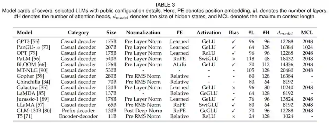 架构在本节中,研究者回顾了 LLMs 的架构设计,即主流架构,预训练目标和细节配置。下表 3 列出了几个具有代表性的 LLMs 的模型卡片以及公开的详细信息。