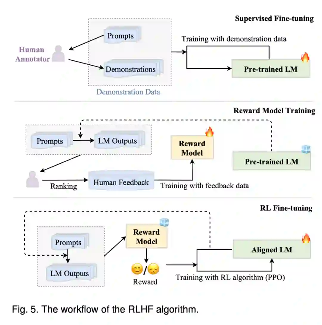 对齐调优这部分首先介绍了对齐的背景及其定义和标准,然后重点介绍了用于对齐 LLMs 的人类反馈数据的收集,最后讨论了用于对齐调整的人类反馈强化学习的关键技术。