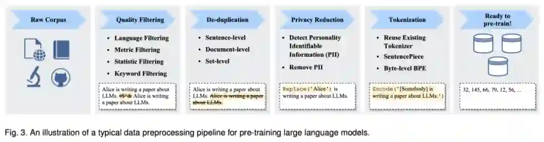 收集大量文本数据后,必须对它们进行预训练以构建预训练语料库,包括去噪、去冗余、去除不相关和潜在有毒的数据。下图 3 展示了为 LLMs 预训练数据的预处理 pipeline。