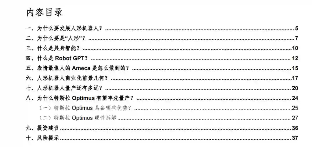 劳动力人口下降、人口老龄化、人力成本上升推动机器换人,“人形”天花板远高于非人形。中国劳动力人口数量持续下滑,美、德、日等多国具有同样趋势,人力成本持续上升,中国已不再是人力低成本国家,机器替代人是一大趋势。“人形”原因主要有:1)“人形”是最适合人类社会所有场景的形态,无需改变场景来适应机器。2)恐怖谷理论下,“人形”的好感度上限远高于非人形。3)“人形”的肢体语言最符合人类认知惯性。 ChatGPT本质是文字接龙,RobotGPT可看作是文字/语言/各类传感器接收的信号-动作接龙,拐点或是适用于机器人运动控制的生成式大模型。斯坦福大学2023年最新论文 《RobotGPT:FromChatGPTtoRobotIntelligence》基于和ChatGPT类似的工作原理构建了RobotGPT的框架。以特斯拉Optimus机器人为例,当前最核心的问题是在算法层面的运动控制,一套适用于机器人运动控制的生成式大模型将对人形机器人有质的提升。 极强通用性的人形机器人将是机器人界的iPhone,类比自动驾驶,通用机器人不需要完全通用才有商业价值。根据第一财经报道,美国当前最低时薪7.25美元,即便只替代最基础的岗位,人力成本也将大幅下降。根据莱特定律,产量从一到十的过程中,生产成本会有三次15%左右的降低,最终生产成本会降到原来的60%左右。过去大多数时间里科技进步是线性的,摩尔定律将其变为了指数级。从1958年半导体的发明到2022年已到达古印度舍罕王故事中“棋盘的后一半”。 特斯拉机器人具备的优势:1)价格:量产价格若在2万美元以内,相比人力成本已经是工业、商业容易接受的价格。2)商业定位明确:从最初的定位就符合特斯拉一贯的PMF(Product/MarketFit)风格,瞄准商业化。3)具备“具身智能”生态:FSD自动驾驶系统、Dojo计算机、D1芯片、大型冲压机、自有工厂做数据采集等。4)迭代速度快:仅一年半便从概念图到完成复杂任务。