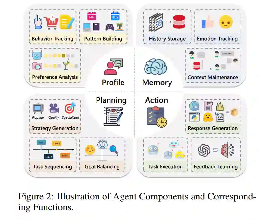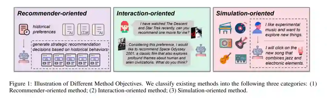 在信息爆炸的时代,推荐系统[Wu et al., 2022] 已成为数字平台中不可或缺的组成部分,帮助用户在电子商务、社交媒体和娱乐领域中浏览海量内容。尽管传统的推荐方法[He et al., 2017]通过分析用户偏好和历史行为,成功地提供了个性化建议,但在实际应用中仍面临诸多挑战,如对复杂用户意图的理解不足、交互能力有限以及无法提供可解释的推荐[Zhu et al., 2024b]。 近期,大型语言模型(LLM)的进展[Achiam et al., 2023]激发了越来越多的研究兴趣,旨在利用LLM驱动的智能体[Wang et al., 2024a]来解决推荐系统中的上述挑战。将LLM驱动的智能体融入推荐系统,相比传统方法,具有若干显著优势[Zhu et al., 2024b]。首先,LLM智能体能够理解复杂的用户偏好,并通过其精密的推理能力生成上下文推荐,从而使得决策过程更加细致,超越简单的特征匹配。其次,它们的自然语言交互能力促进了多轮对话,能够主动探索用户兴趣并提供可解释的解释,增强了推荐准确性和用户体验。第三,这些智能体通过生成更加真实的用户画像,结合情感状态和时间动态,彻底改变了用户行为模拟,从而提高了系统评估的有效性。此外,LLM的预训练知识和强大的泛化能力促进了跨领域的知识转移,能够以最少的额外训练应对冷启动等长期存在的挑战[Shu et al., 2024]。 在本综述中,我们全面回顾了LLM驱动的智能体在推荐系统中的应用。首先,我们介绍了传统推荐系统的背景,并讨论了它们在理解复杂用户意图、交互能力和可解释性方面的局限性。接着,我们系统地审视了LLM驱动的智能体如何通过三种主要范式解决这些挑战:面向推荐的(如[Wang et al., 2024b; Wang et al., 2024c])、面向交互的(如[Zeng et al., 2024; Friedman et al., 2023])和面向仿真的(如[Yoon et al., 2024; Guo et al., 2024])方法。然后,我们提出了一种统一的智能体架构,包含四个核心模块(个人资料[ Cai et al., 2024; Zhang et al., 2024c]、记忆[ Shi et al., 2024; Fang et al., 2024]、规划[ Wang et al., 2023b; Shi et al., 2024]、行动[ Zhu et al., 2024a; Zhao et al., 2024]),并分析了现有方法如何实现这些模块。进一步地,我们编制了现有基准数据集(包括Amazon系列、MovieLens、Steam等)和评估方法的全面比较,涵盖了传统推荐指标和新兴的评估方法。最后,我们探讨了该领域几个有前景的未来研究方向。