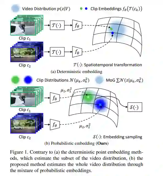 本文提出了一种融合了对比学习和概率表示的自监督表示学习方法——概率视频对比学习。我们假设构成视频的片段在短期内有不同的分布,但可以通过组合在一个共同的嵌入空间中来表示复杂和复杂的视频分布。因此,该方法将视频片段表示为正态分布,并将它们组合成混合高斯分布来建模整个视频分布。通过从整个视频分布中进行采样嵌入,我们可以绕过仔细的采样策略或转换来生成视频片段的增强视图,而不像以前的确定性方法主要关注对比学习中的这种样本生成策略。我们进一步提出了一种随机对比损失来学习合适的视频分布和处理原始视频的固有不确定性。实验结果证明,在UCF101和HMDB51等最流行的基准上,我们的概率嵌入是一种最先进的视频表示学习,用于动作识别和视频检索。