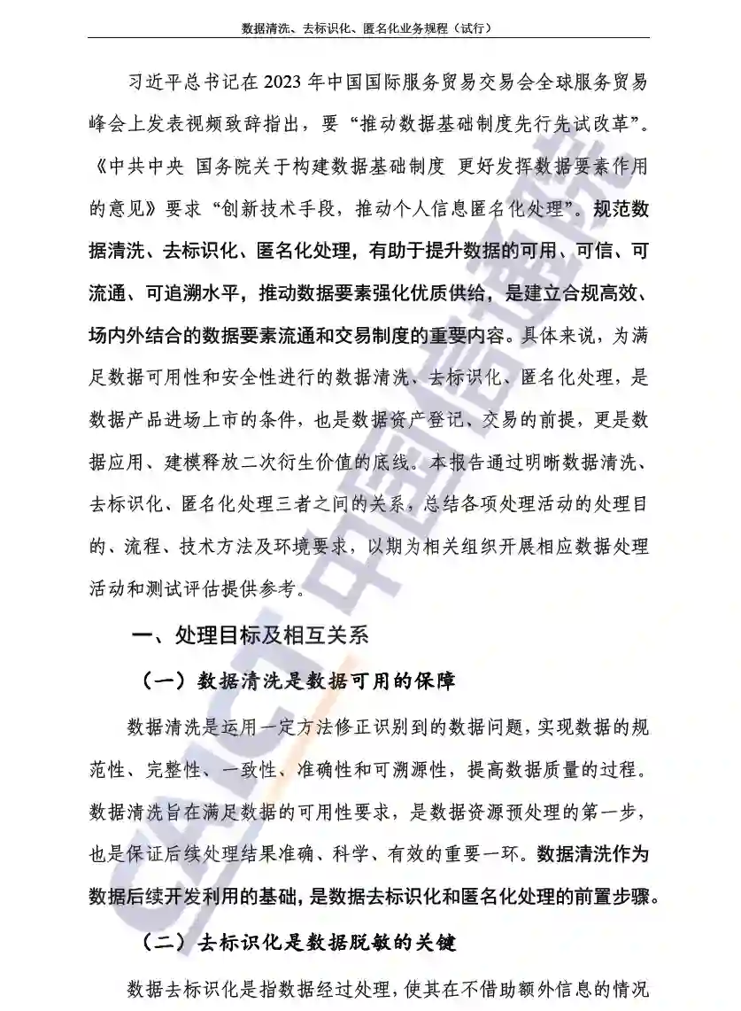 规范数据清洗、去标识化、匿名化处理等业务活动,有助于提升数据的可用、可信、可流通、可追溯水平,推动数据要素强化优质供给,是促进数据要素化和要素市场化的必经步骤。
