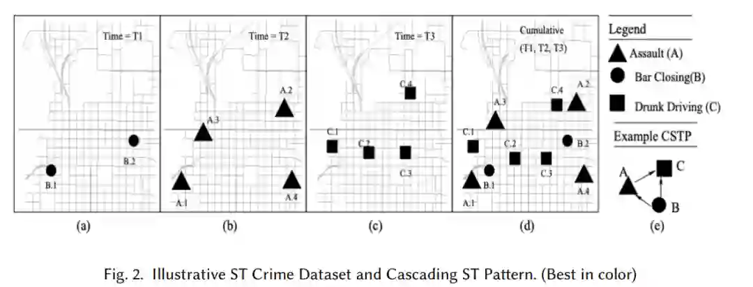 图2显示了时空(ST)模式的一个示例。该图描述了一个城市犯罪数据集输出的级联时空模式[45],涉及几种事件类型(酒吧倒闭、醉驾、袭击)。图2(a) -2 (c)显示了每个事件类型的实例及其时间和位置,图2(e)显示了相同的事件实例。检测到的ST模式提出了一个有趣的假设,即酒吧在关闭时是附近地区醉酒驾驶和攻击犯罪的潜在发生期。这些信息可以帮助执法机构、公共安全组织和决策者确定适当的减轻犯罪行动。