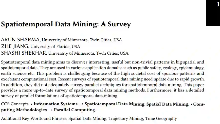 时空数据挖掘的目的是在大的空间和时空数据中发现有趣的、有用的但非平凡的模式。应用于公共安全、生态学、流行病学、地球科学等领域。这个问题是具有挑战性的,因为虚假模式的高社会成本和过高的计算成本。近年来的时空数据挖掘研究因其快速增长而需要更新。此外,他们没有充分研究时空数据挖掘的并行技术。本文介绍了时空数据挖掘方法的最新进展。其次,对时空数据挖掘的并行计算方法进行了详细的综述; 时空数据挖掘是在大规模的时空数据中发现新的、非平凡的但潜在有用的模式的过程。时空(ST)数据包括地理参考的气候变量、流行病爆发、犯罪事件、社交媒体、交通、交通动态等。由于其跨学科性质,分析和挖掘这些数据对于推进许多科学问题和现实世界应用的最先进技术是非常重要的。因此ST数据在公共安全、生态学、流行病学等多个领域的应用尤为突出。