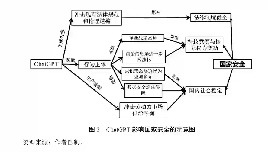ChatGPT作为人工智能发展新的里程碑,在语言表达、自我强化等方面表现突出,展现出生成式人工智能的广泛运用前景,在多领域引起广泛关注,以ChatGPT为代表的生成式人工智能将会可预期地改变国家安全态势。在意识形态安全层面,对生成式人工智能的恶意运用使渗透方式更加多元,渗透效能更加显著。在国际舆论层面,对生成式人工智能的大规模使用将进一步使舆论场复杂化。在国家实力发展层面,生成式人工智能将继续拉大国家实力差距,国内公共权力与权威进一步分散。在军事安全层面,生成式人工智能赋能战场信息收集和战场指挥,国家之间的认知战对抗能力重要性日益提升。在法律规范层面,当前生成式人工智能的责任主体不明晰,现有法律法规难以约束基于该技术开展的犯罪行为。在社会稳定方面,生成式人工智能冲击劳动力市场,重塑人才发展模式。面对新技术冲击下急剧变化的新安全态势,应建立更多元协同的创新和应用体系,在国际上共享发展成果,完善法律体系,推动该技术服务于国家利益发展与人类命运共同体的构建。