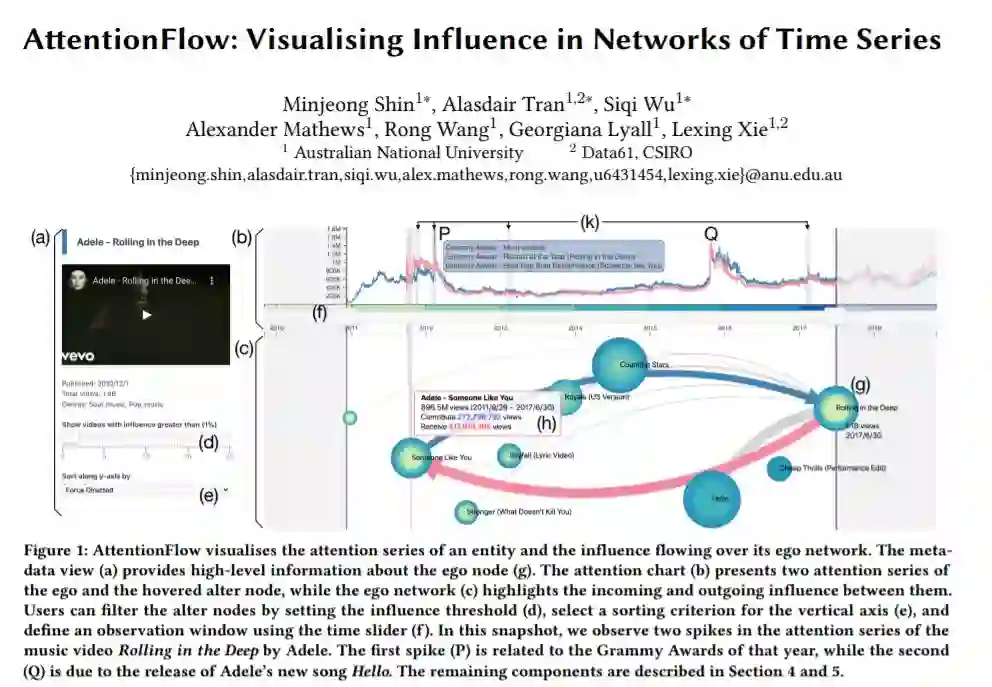 对网页、搜索词和视频等在线项目的集中关注反映了社会、文化和经济利益的趋势。此外,不同项目的关注趋势通过超链接或推荐等机制表现出相互影响。许多可视化工具存在的时间序列,网络演化,或网络影响;然而,很少有系统能将三者连接起来。在这项工作中,我们提出了“注意力流”,一种新的系统来可视化时间序列网络及其对彼此的动态影响。以自我节点为中心,我们的系统使用两种视觉编码同时呈现每个节点的时间序列:一个树轮代表概述,一个折线图代表细节。注意力流支持交互作用,如叠加影响的时间序列,并根据时间或流量过滤邻居。我们使用两个真实世界的数据集,VevoMusic和WikiTraffic来演示注意力流。我们表明,歌曲的注意力峰值可以解释为外部事件,如重大奖项,或网络变化,如一首新歌的发行。独立的案例研究也证明了艺术家的影响力如何改变他们的职业生涯,相关的维基百科流量是由文化兴趣驱动的。更广泛地说,注意力流可以推广到在物理基础设施(如道路网络)或自然现象(如天气和地质测量)上可视化时间序列网络。