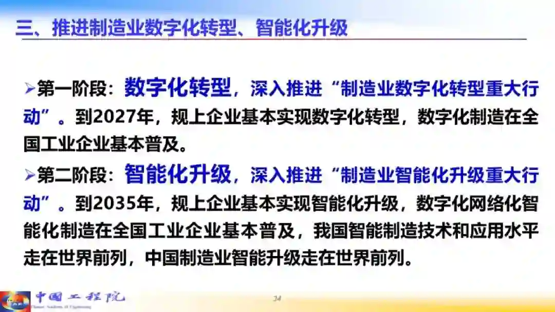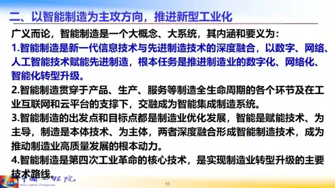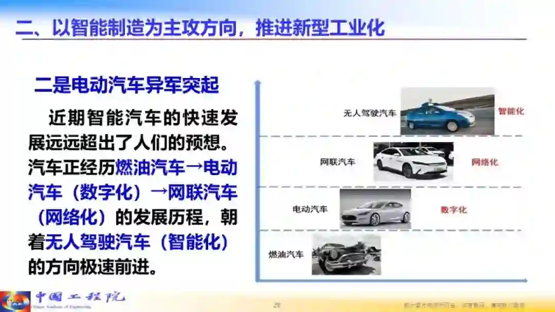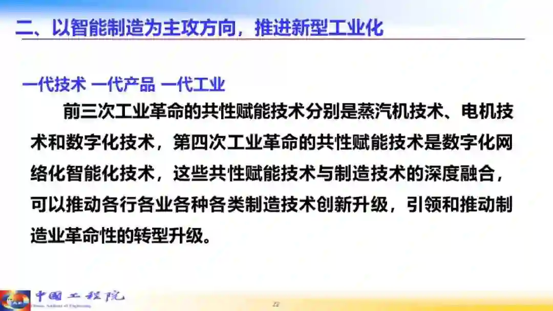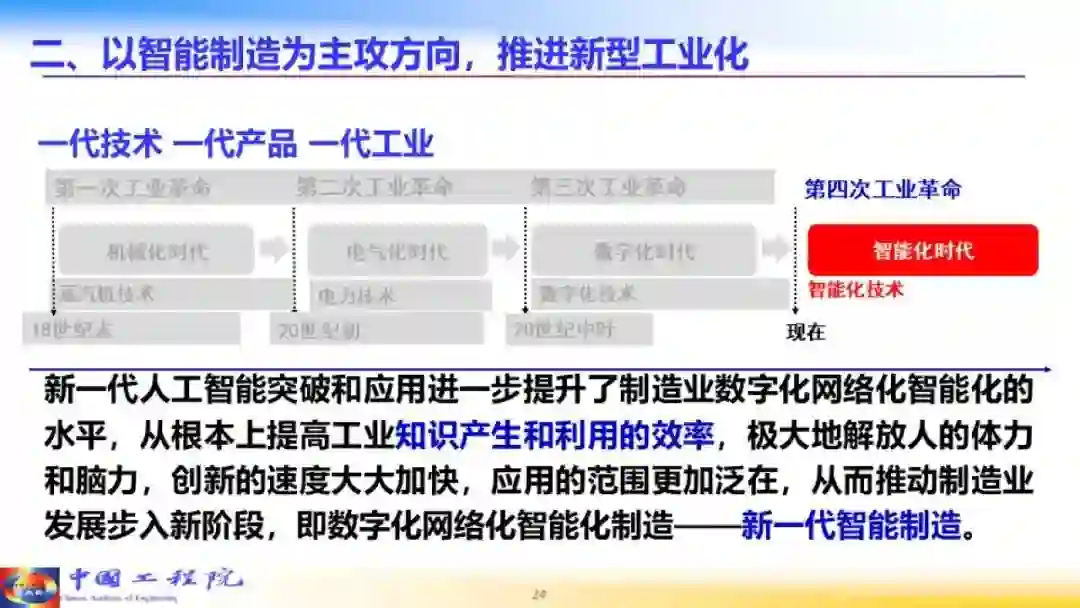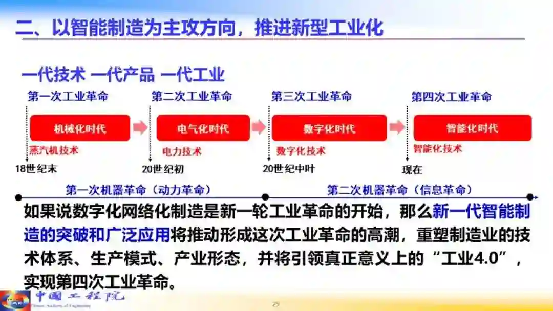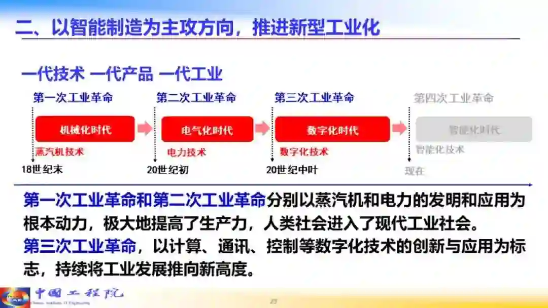 12月6日,在2023世界智能制造大会上,中国工程院院士周济表示,如果说数字化、网络化制造是新一轮工业革命的开始,那么新一代智能制造的突破和广泛应用,将推动形成这次工业革命的高潮,重塑制造业的技术体系、生产模式、产业形态,并将引领真正意义上的工业4.0,实现第四次工业革命。 “一代技术,一代产品,一代工业。”周济说,前三次工业革命的共性赋能技术分别是蒸汽机技术、电机技术和数字化技术,第四次工业革命的共性赋能技术是数字化网络化智能化技术,这些共性赋能技术与制造技术的深度融合,可以推动各行各业各种各类制造技术创新升级,引领和推动制造业的革命性转型升级。 新一代人工智能突破和应用进一步提升了制造业数字化网络化智能化的水平,从根本上提高了工业知识产生和利用的效率,极大地解放了人的体力和脑力,创新的速度大大加快,应用的范围更加泛在,从而推动制造业发展步入新阶段,即数字化网络化智能化制造——新一代智能制造。 周济表示,去年以来,有两个重大的突破进一步坚定了我们以智能制造为主攻方向的信心和决心。第一是ChatGPT横空出世,人工智能进入了大模型时代,百模千态赋能千行万业,人类社会正在加速迈向智能世界;第二是电动汽车的异军突起,汽车正在经历从燃油汽车走向电动汽车(数字化)再到网联汽车(网络化)的发展历程,朝着无人驾驶汽车(智能化)的方向极速前进。 “中国新能源汽车产业为什么能够‘异军突起、出奇制胜’?”周济认为,答案是技术创新,数字化、网络化、智能化,以及开道超车、跨越发展。这带给我们的启示是,要紧紧抓住第四次工业革命的历史机遇,坚持以创新为第一动力,以智能制造为主攻方向,推进制造业数字化转型、智能化升级,助力我国制造业由大变强,实现制造强国建设的伟大历史任务。 从现在到2035年,我国智能制造发展总体分成两个阶段来实现:第一阶段是数字化转型阶段,到2027年,我国规上企业基本实现数字化转型,数字化制造在全国工业企业基本普及;第二阶段是智能化升级,从2028年到2035年,争取规上企业基本实现智能化升级,数字化、网络化、智能化制造,在全国工业企业基本普及。 周济认为,从现在到2035年,是中国制造业实现由大到强的关键时期,也是制造业发展质量变革、效率变革、动力变革的关键时期。 为此,周济提出4条建议:一是以企业为主体,产学研金政协同推进,在全国工业企业大规模普及性推进技术改造-数字化转型;二是新一代智能制造技术将引起制造业革命性转型升级,今后五年要开展新一代智能制造技术的攻关、试点和示范;三是筑牢工业互联网等数字基础设施关键底座,推动工业互联网在重点产业链广泛普及、深度融合;四是完善数字化转型服务体系,形成新兴的强大的智能制造产业集群。 附:国际智能制造联盟荣誉主席、中国工程院院士周济12月6日在2023世界智能制造大会开幕式上所做的主旨报告。