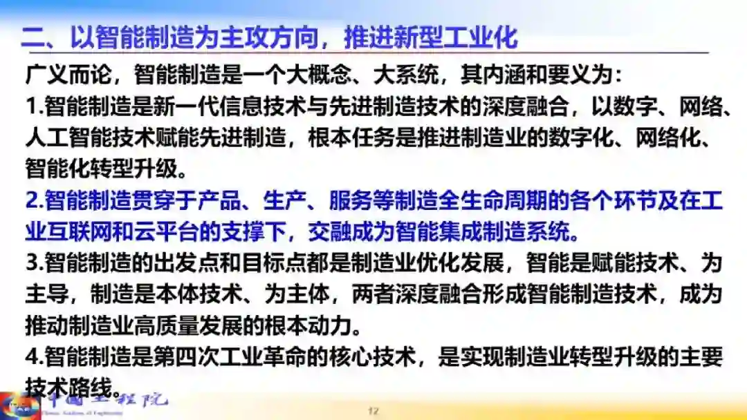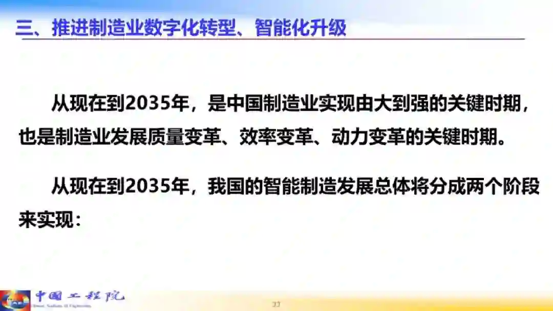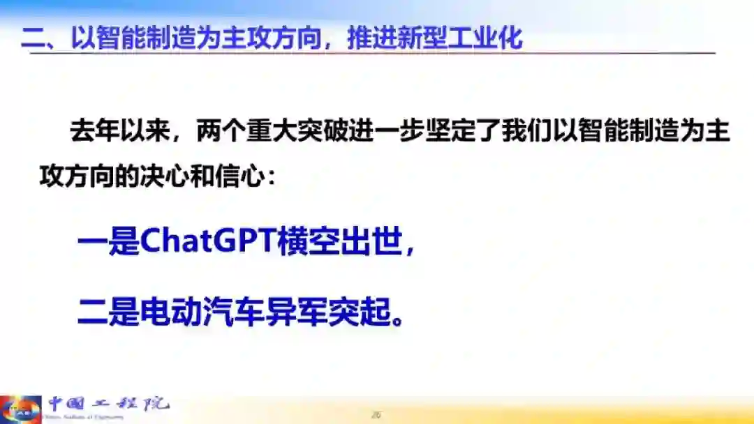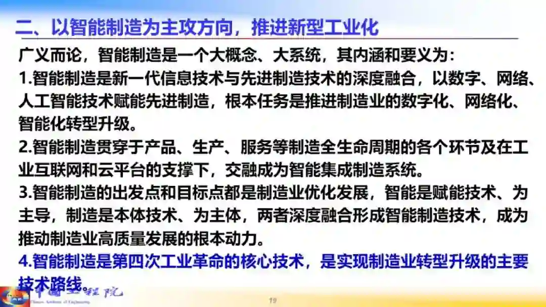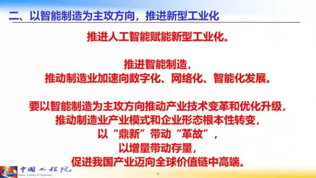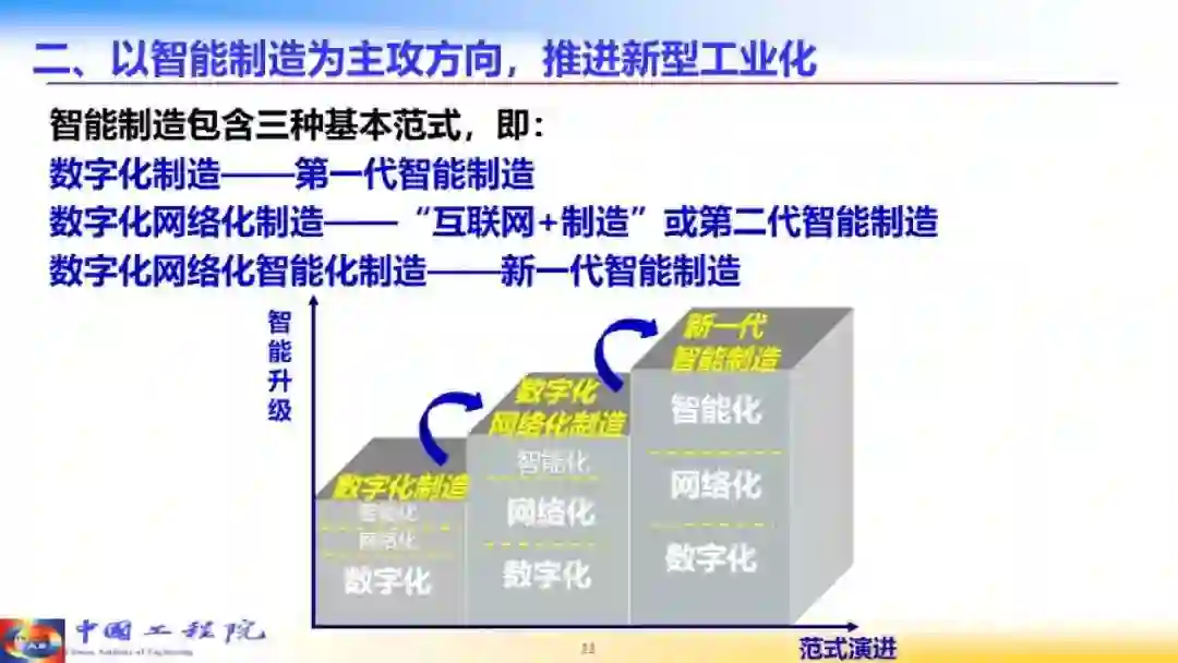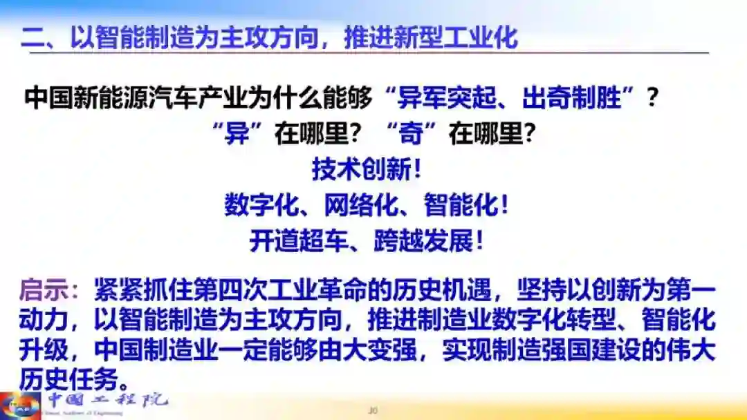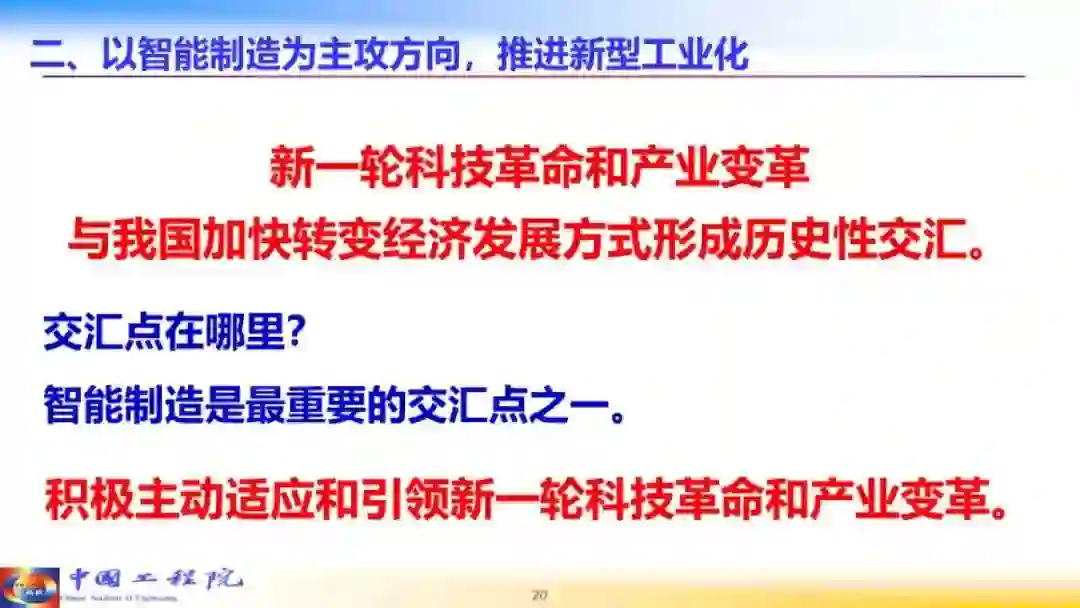 12月6日,在2023世界智能制造大会上,中国工程院院士周济表示,如果说数字化、网络化制造是新一轮工业革命的开始,那么新一代智能制造的突破和广泛应用,将推动形成这次工业革命的高潮,重塑制造业的技术体系、生产模式、产业形态,并将引领真正意义上的工业4.0,实现第四次工业革命。 “一代技术,一代产品,一代工业。”周济说,前三次工业革命的共性赋能技术分别是蒸汽机技术、电机技术和数字化技术,第四次工业革命的共性赋能技术是数字化网络化智能化技术,这些共性赋能技术与制造技术的深度融合,可以推动各行各业各种各类制造技术创新升级,引领和推动制造业的革命性转型升级。 新一代人工智能突破和应用进一步提升了制造业数字化网络化智能化的水平,从根本上提高了工业知识产生和利用的效率,极大地解放了人的体力和脑力,创新的速度大大加快,应用的范围更加泛在,从而推动制造业发展步入新阶段,即数字化网络化智能化制造——新一代智能制造。 周济表示,去年以来,有两个重大的突破进一步坚定了我们以智能制造为主攻方向的信心和决心。第一是ChatGPT横空出世,人工智能进入了大模型时代,百模千态赋能千行万业,人类社会正在加速迈向智能世界;第二是电动汽车的异军突起,汽车正在经历从燃油汽车走向电动汽车(数字化)再到网联汽车(网络化)的发展历程,朝着无人驾驶汽车(智能化)的方向极速前进。 “中国新能源汽车产业为什么能够‘异军突起、出奇制胜’?”周济认为,答案是技术创新,数字化、网络化、智能化,以及开道超车、跨越发展。这带给我们的启示是,要紧紧抓住第四次工业革命的历史机遇,坚持以创新为第一动力,以智能制造为主攻方向,推进制造业数字化转型、智能化升级,助力我国制造业由大变强,实现制造强国建设的伟大历史任务。 从现在到2035年,我国智能制造发展总体分成两个阶段来实现:第一阶段是数字化转型阶段,到2027年,我国规上企业基本实现数字化转型,数字化制造在全国工业企业基本普及;第二阶段是智能化升级,从2028年到2035年,争取规上企业基本实现智能化升级,数字化、网络化、智能化制造,在全国工业企业基本普及。 周济认为,从现在到2035年,是中国制造业实现由大到强的关键时期,也是制造业发展质量变革、效率变革、动力变革的关键时期。 为此,周济提出4条建议:一是以企业为主体,产学研金政协同推进,在全国工业企业大规模普及性推进技术改造-数字化转型;二是新一代智能制造技术将引起制造业革命性转型升级,今后五年要开展新一代智能制造技术的攻关、试点和示范;三是筑牢工业互联网等数字基础设施关键底座,推动工业互联网在重点产业链广泛普及、深度融合;四是完善数字化转型服务体系,形成新兴的强大的智能制造产业集群。 附:国际智能制造联盟荣誉主席、中国工程院院士周济12月6日在2023世界智能制造大会开幕式上所做的主旨报告。