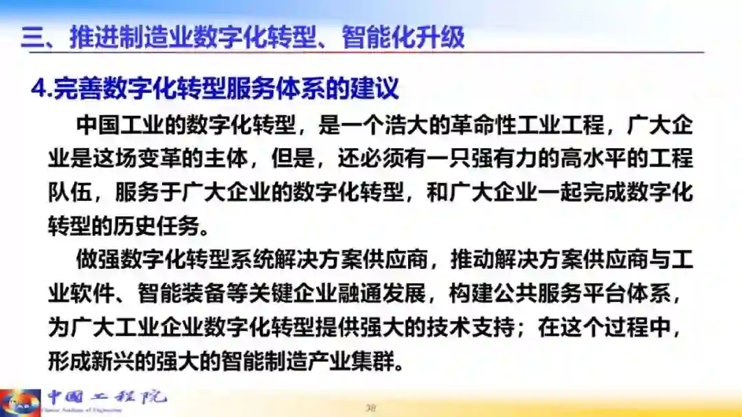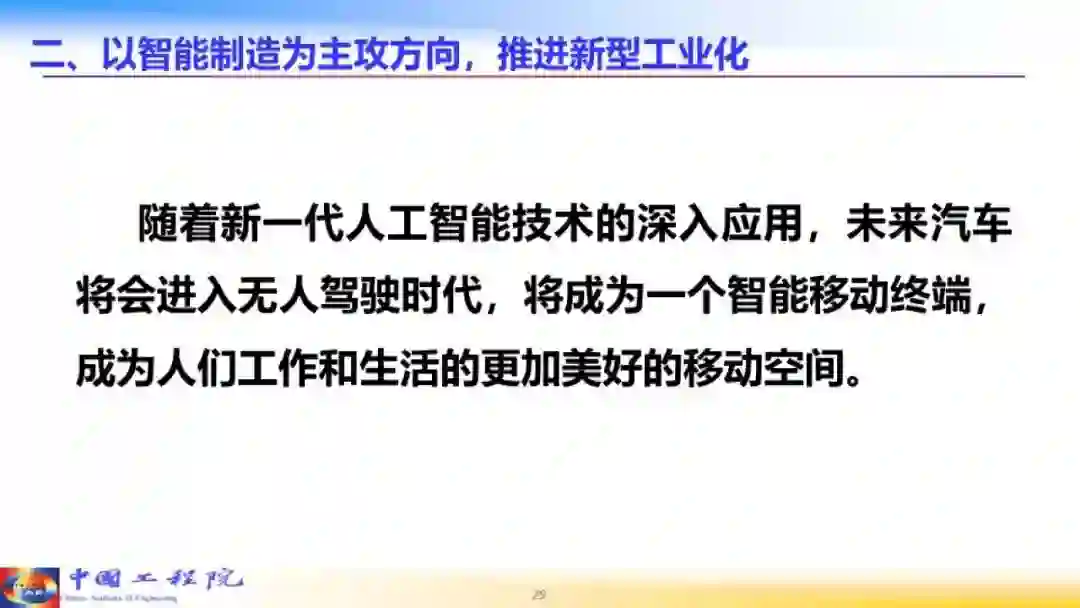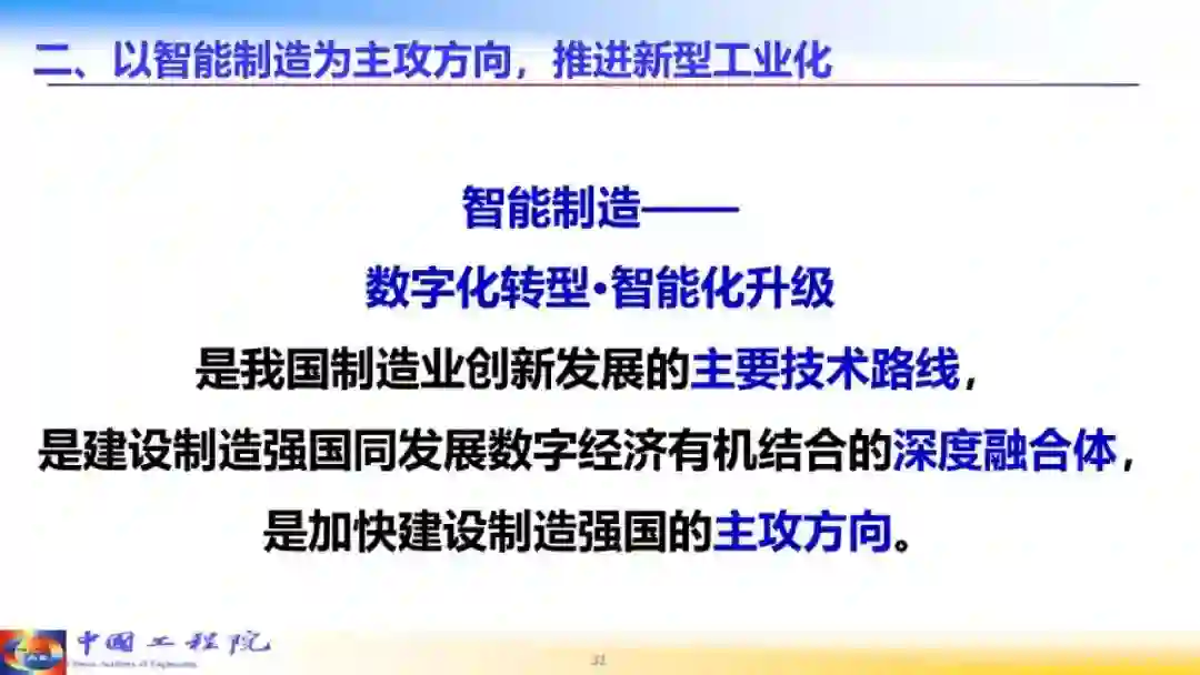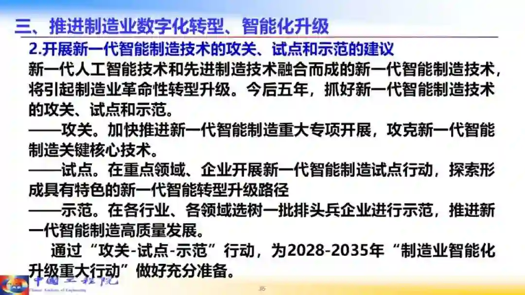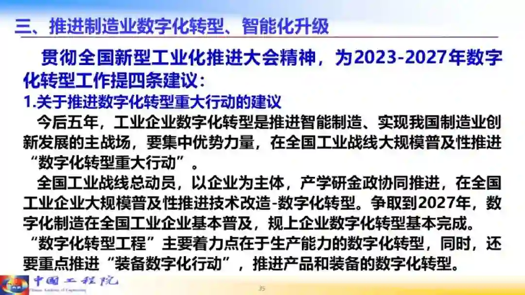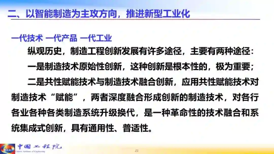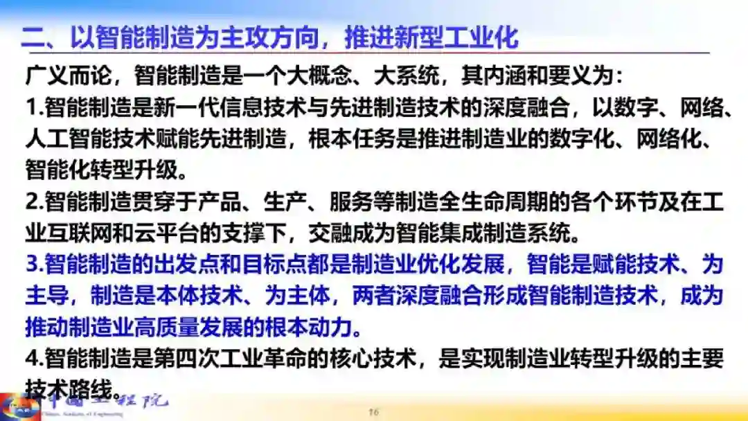 12月6日,在2023世界智能制造大会上,中国工程院院士周济表示,如果说数字化、网络化制造是新一轮工业革命的开始,那么新一代智能制造的突破和广泛应用,将推动形成这次工业革命的高潮,重塑制造业的技术体系、生产模式、产业形态,并将引领真正意义上的工业4.0,实现第四次工业革命。 “一代技术,一代产品,一代工业。”周济说,前三次工业革命的共性赋能技术分别是蒸汽机技术、电机技术和数字化技术,第四次工业革命的共性赋能技术是数字化网络化智能化技术,这些共性赋能技术与制造技术的深度融合,可以推动各行各业各种各类制造技术创新升级,引领和推动制造业的革命性转型升级。 新一代人工智能突破和应用进一步提升了制造业数字化网络化智能化的水平,从根本上提高了工业知识产生和利用的效率,极大地解放了人的体力和脑力,创新的速度大大加快,应用的范围更加泛在,从而推动制造业发展步入新阶段,即数字化网络化智能化制造——新一代智能制造。 周济表示,去年以来,有两个重大的突破进一步坚定了我们以智能制造为主攻方向的信心和决心。第一是ChatGPT横空出世,人工智能进入了大模型时代,百模千态赋能千行万业,人类社会正在加速迈向智能世界;第二是电动汽车的异军突起,汽车正在经历从燃油汽车走向电动汽车(数字化)再到网联汽车(网络化)的发展历程,朝着无人驾驶汽车(智能化)的方向极速前进。 “中国新能源汽车产业为什么能够‘异军突起、出奇制胜’?”周济认为,答案是技术创新,数字化、网络化、智能化,以及开道超车、跨越发展。这带给我们的启示是,要紧紧抓住第四次工业革命的历史机遇,坚持以创新为第一动力,以智能制造为主攻方向,推进制造业数字化转型、智能化升级,助力我国制造业由大变强,实现制造强国建设的伟大历史任务。 从现在到2035年,我国智能制造发展总体分成两个阶段来实现:第一阶段是数字化转型阶段,到2027年,我国规上企业基本实现数字化转型,数字化制造在全国工业企业基本普及;第二阶段是智能化升级,从2028年到2035年,争取规上企业基本实现智能化升级,数字化、网络化、智能化制造,在全国工业企业基本普及。 周济认为,从现在到2035年,是中国制造业实现由大到强的关键时期,也是制造业发展质量变革、效率变革、动力变革的关键时期。 为此,周济提出4条建议:一是以企业为主体,产学研金政协同推进,在全国工业企业大规模普及性推进技术改造-数字化转型;二是新一代智能制造技术将引起制造业革命性转型升级,今后五年要开展新一代智能制造技术的攻关、试点和示范;三是筑牢工业互联网等数字基础设施关键底座,推动工业互联网在重点产业链广泛普及、深度融合;四是完善数字化转型服务体系,形成新兴的强大的智能制造产业集群。 附:国际智能制造联盟荣誉主席、中国工程院院士周济12月6日在2023世界智能制造大会开幕式上所做的主旨报告。