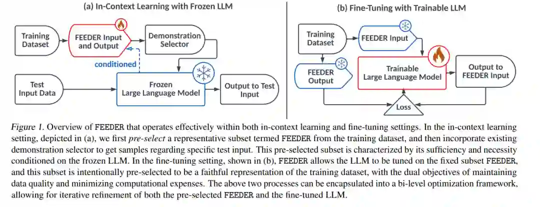 为此,我们提出了FEEDER(FEw yet Essential Demonstration prE-selectoR),一种新颖的预选择框架,它识别包含训练数据中最具代表性的示范子集,并针对特定的LLM进行定制。为了构建这个子集,我们在预选择阶段引入了“充分性”和“必要性”指标,并设计了一种基于树的算法来高效识别代表性示例。一旦预选完成,这个代表性子集可以有效替代完整的训练数据,在提高效率的同时保持ICL中的可比性能。 此外,我们的预选子集还对微调LLM有帮助,我们引入了一种双层优化方法,在不牺牲性能的前提下提高了训练效率。对于参数从3亿到80亿的LLM的实验结果表明,FEEDER可以减少超过20%的训练数据量,同时保持性能,并与ICL中的各种下游示范选择策略无缝集成。