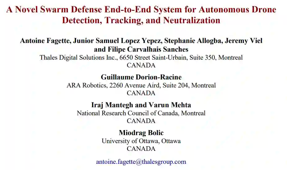 拟议的反无人机系统集成了地面段和空中段。地面部分由一个地面控制站、一个地面雷达和一个用于远距离探测、分类和定位来袭威胁的 PTZ 摄像机组成。空中部分由五架无人机组成,每架无人机都嵌入了一个光电传感器和一个可部署的网,作为消除威胁的有效载荷。这些无人机以蜂群形式自主部署,拦截、跟踪、评估和消除入侵的无人机,同时保持人类操作员在环路中。每架无人机都由自己的智能体操作,与其他无人机和人类操作员协同工作。该系统具有可扩展性和适应性。地面传感器的数量、类型和在空间中的分布可根据需要和保护空间的配置进行调整。防御无人机的数量及其有效载荷也同样可以调整。该系统依靠机器学习技术来探测、跟踪和定位入侵者,并适应不断变化的威胁。