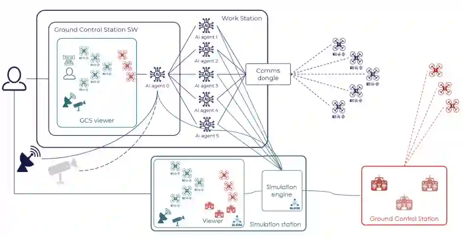 在模拟和实际演示中,该系统集成了一个雷达、一个 PTZ 摄像机、一个由五架无人机组成的防御群、最多五架入侵无人机、每个防御群一个地面控制站(GCS)、每架防御无人机上的嵌入式摄像机和一个模拟站。每架无人机和地面控制站都通过各自的智能体进行操作。在真实世界的飞行演示中,还集成了其他组件,以符合现行的安全和法律标准(如手动无人机控制器或控制 STOP 操作系统)。现场操作人员包括技术人员、安全飞行观察员、飞行员和地面控制站操作员。