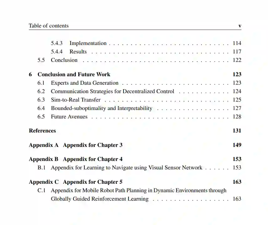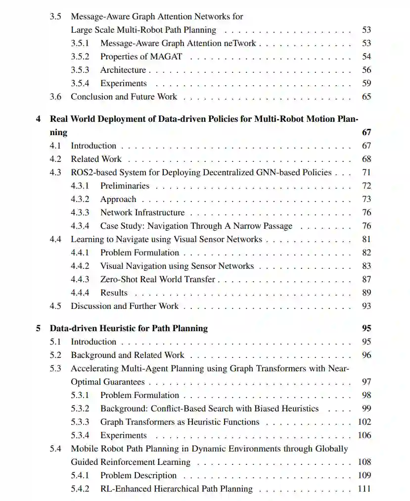 在我博士研究期间,我首先提出了面向多机器人协调的通信感知运动规划,引入了GNN来构建多机器人团队的通信通道,使它们可以学会如何显式地进行通信。通过基于端到端模仿学习流程的各种仿真实验,验证了这一新颖研究思想的可行性。为了将它们移植到现实中,我们构建了一个基于ROS2的系统,通过临时通信在多机器人通道情景中展示我们的思想,并在未知环境中通过随机采样的基于摄像头的传感器辅助单机器人导航。最后,我们通过在CBS的焦点搜索中引入启发式函数,并设计了一种名为G2RL的新型奖励机制,为先前的黑箱方法提供了解释和性能保证的方法。