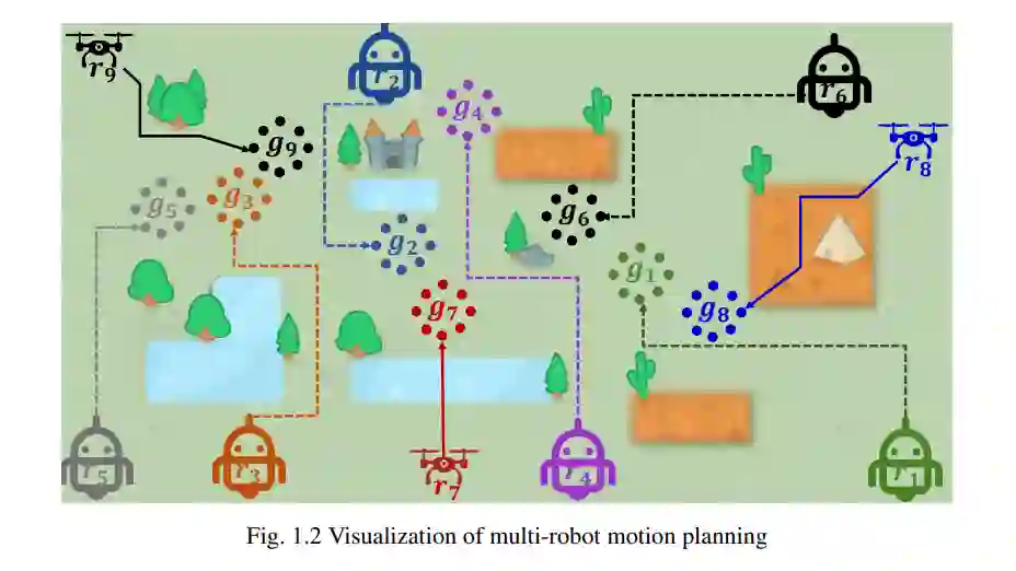 人口的快速增长和持续的城市化产生了对具有高生产率和效率的自动化系统的需求。多机器人系统的发展旨在通过控制一组机器人来处理大规模和复杂的任务(例如在地震后进行搜救操作)。控制这种系统的关键组成部分是在给定环境中引导每个机器人从起始位置到目标位置,使用无碰撞路径,这称为多机器人运动规划。随着团队规模的增加,基于集中式方法计算解决方案变得计算上昂贵且难以处理。因此,研究人员一直在探索分散式方法,以单独为每个机器人计算轨迹,并仅在出现冲突情况下进行重新规划。这种方法可以最大程度地减少任务的计算复杂性,但容易产生次优和部分解决方案。在计算解决方案的最优性和完整性保证之间取得平衡仍然是一个未解决的问题。
