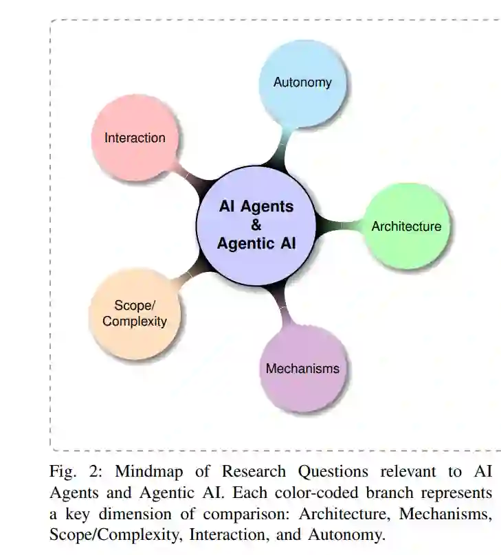 要—本综述在概念上明确区分了AI智能体与代理式AI(Agentic AI),通过构建结构化的概念分类体系、应用映射与挑战分析,厘清二者在设计理念与能力上的差异。我们首先介绍文献检索策略与基本定义,将AI智能体界定为由大语言模型(LLM)和大多模态模型(LIM)驱动的模块化系统,主要用于执行特定任务的自动化操作。生成式AI被视为前身,AI智能体的发展体现在工具集成、提示工程和推理能力增强等方面。 与此不同,代理式AI代表一种范式转变,其核心特征包括多智能体协作、动态任务拆解、持久记忆机制与自主行为的统一编排。我们通过架构演化、运行机制、交互方式与自主性层级等维度,系统对比了两种范式的异同。 在应用场景方面,AI智能体常用于客户支持、日程管理与数据摘要等任务,而代理式AI则被应用于科研自动化、机器人协同与医疗决策支持等更具复杂性和自主性的领域。我们还分析了两类系统面临的关键挑战,如幻觉现象、脆弱性、涌现行为以及协同失败,并提出包括ReAct闭环机制、RAG检索增强生成、编排层架构和因果建模等在内的应对策略。 本研究旨在为构建稳健、可扩展且可解释的AI系统提供清晰的理论路径与技术参考。 关键词:AI智能体,代理式AI,自主性,推理,情境感知,多智能体系统,概念分类,视觉-语言模型
