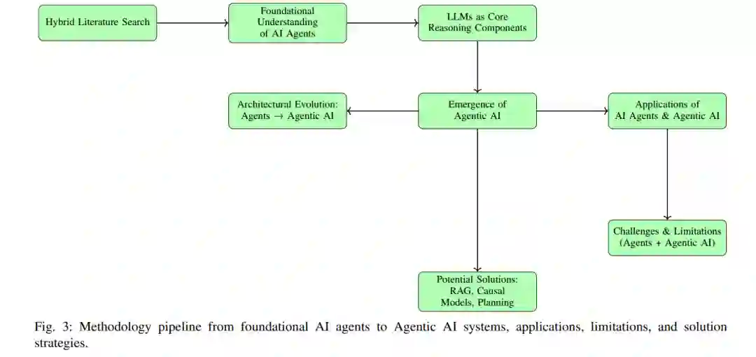 本文采用结构化的多阶段方法论,系统回顾了AI智能体与代理式AI在演进路径、系统架构、应用场景与技术挑战方面的最新进展。方法流程如图3所示,依照从基础智能体构造到高级多智能体编排的逻辑展开。分析框架基于对学术文献与AI工具平台的综合综述,力求全面呈现当前研究格局与未来发展方向。 首先,我们界定AI智能体的基本概念、设计原则与系统模块,包括感知、推理与行动选择等功能,结合早期的应用场景(如客服机器人与信息检索助手),构建对代理范式的初步理解。 接着,我们探讨LLM作为核心推理组件的角色,阐明其通过指令微调与人类反馈强化学习(RLHF)实现自然语言交互、规划与初步决策能力。同时,我们也指出其局限性,如幻觉现象、知识静态化与因果推理缺失。 随后,本文进入代理式AI阶段,重点解析单体工具增强型系统如何演化为多智能体协同生态。这一转变源于对能够进行任务拆解、子任务分配、结果协调与动态适应系统的实际需求,而这些能力远超传统AI智能体的范围。 接下来的章节深入分析AI智能体与代理式AI架构的演化,比较简单模块化设计与复杂编排框架之间的区别。我们涵盖的关键增强功能包括:持久内存机制、元智能体协调、多智能体规划闭环(如ReAct与Chain-of-Thought提示)及语义通信协议,并辅以AutoGPT、CrewAI与LangGraph等典型平台示例。 在应用层面,我们归纳了两个范式下的典型场景:AI智能体适用于知识检索、邮件自动化与报告摘要等任务,而代理式AI更适用于研究助手、机器人群体控制与企业战略规划等复杂协同任务。每类应用均结合系统复杂性、实时决策需求与协同执行能力展开讨论。 随后,我们系统分析了两种范式所面临的主要挑战。AI智能体常见问题包括幻觉、提示脆弱性、规划深度有限与因果缺失;代理式AI则面临更高层次挑战,如智能体协同失衡、错误传播、涌现行为难以预测、可解释性不足与对抗攻击风险等。 最后,我们讨论了一系列潜在解决方案,包括因果建模、检索增强生成(RAG)、多智能体记忆架构与稳健评估机制。这些策略不仅是技术补丁,更是推动代理式系统扩展至医疗、金融、自动化机器人等关键领域的基础条件。 综上所述,本文通过分阶段的系统性评估,力求为AI智能体与代理式AI的研究与实践提供清晰的理论框架与可行路径。