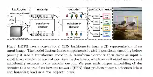 本文的Detection Transformer(DETR,请参见图1)可以预测所有物体的剧烈运动,并通过设置损失函数进行端到端训练,该函数可以在预测的物体与地面真实物体之间进行二分匹配。DETR通过删除多个手工设计的后处理过程例如nms,对先验知识进行编码的组件来简化检测流程。与大多数现有的检测方法不同,DETR不需要任何自定义层,因此可以在包含标准CNN和转换器类的任何框架中轻松复制。
