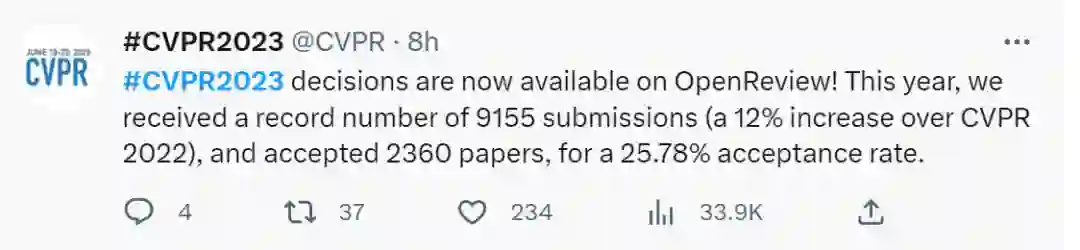根据官方信息统计,今年共收到 9155 份提交,比去年增加了 12%,创下新纪录,今年接收了 2360 篇论文,接收率为 25.78%。作为对比,去年有 8100 多篇有效投稿,大会接收了 2067 篇,接收率为 25%。