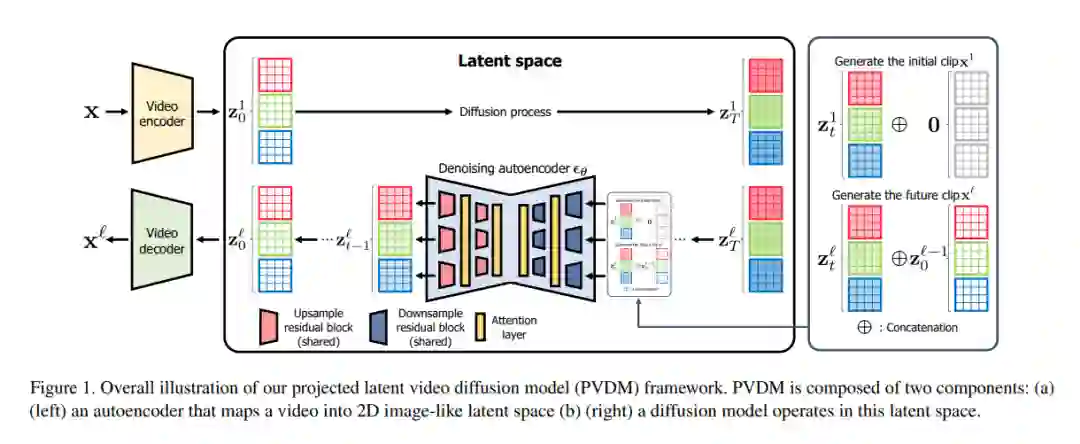 尽管深度生成模型取得了显著进展,但由于其高维和复杂的时间动态以及大的空间变化,合成高分辨率和时间连贯的视频仍然是一个挑战。最近关于扩散模型的工作显示了解决这一挑战的潜力,但它们存在严重的计算和内存效率低下,限制了可扩展性。为解决这个问题,本文提出一种新的视频生成模型,即投影潜视频扩散模型(PVDM),一种概率扩散模型,在低维潜空间中学习视频分布,因此可以在有限资源下有效地对高分辨率视频进行训练。PVDM由两个组件组成:(a)一个自动编码器,将给定视频投影为二维形状的潜向量,分解视频像素的复杂立方结构;(b)一个专门为新的分解潜空间设计的扩散模型架构,以及用单个模型合成任意长度视频的训练/采样程序。在流行的视频生成数据集上的实验结果表明,PVDM比之前的视频合成方法具有更好的性能;PVDM在UCF-101长视频(128帧)生成基准上获得了639.7的FVD分数,比之前的最先进水平提高了1773.4。