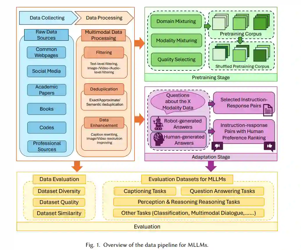 Q1:如何收集、选择和管理MLLMs的数据?大量的数据需求和多模态数据的异质性在收集、选择和有效管理模型训练数据方面带来了挑战。MLLMs的不同训练阶段也导致了不同的数据类型需求。