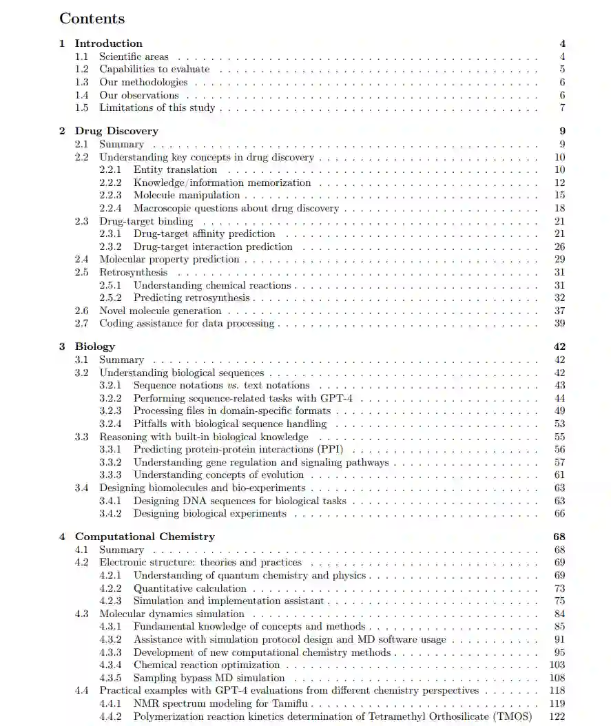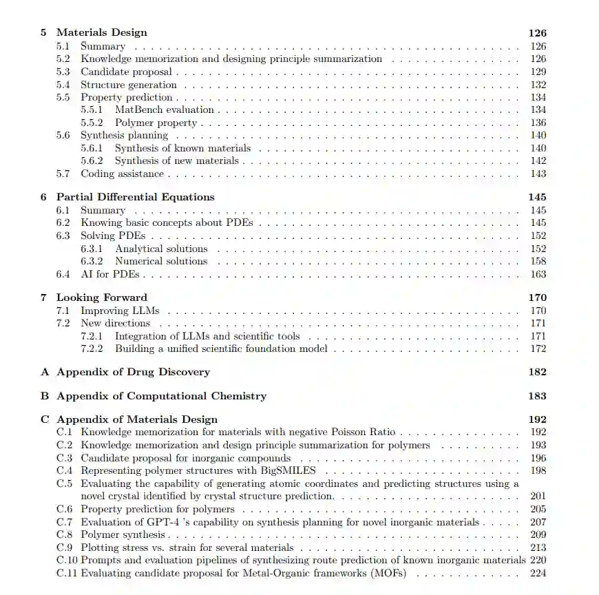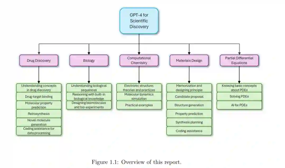 本报告的总结可以在图 1.1 中找到。自然科学致力于通过系统的观察、实验和可检验假设的制定来理解自然世界。这些努力旨在揭示支配宇宙的基本原则和法则,范围从最小的亚原子粒子到最大的星系甚至更远。自然科学是一个非常多样化的领域,涵盖了广泛的学科,包括研究非生命系统的物理科学和研究生命有机体的生命科学。在本研究中,我们选择集中研究自然科学领域的一部分子领域,这些子领域既包括物理科学也包括生命科学。值得注意的是,这些领域并不是相互独立的;例如,药物发现与生物学有很大的重叠,它们也不都属于自然科学分类中的同一层次。药物发现是识别和开发新的候选药物,以治疗或预防特定疾病和医疗条件的过程。这个复杂且多面向的领域旨在通过创造安全、有效和有针对性的治疗剂来改善人类健康和福祉。在本报告中,我们探讨了GPT-4如何帮助药物发现研究(第2节),并研究了药物发现中的几个关键任务:知识理解(第2.2节)、分子属性预测(第2.4节)、分子操纵(第2.2.3节)、药物-靶标结合预测(第2.3节)和逆合成(第2.5节)。生物学是生命科学的一个分支,研究生命和生命有机体,包括它们的结构、功能、生长、起源、进化、分布和分类。作为一个广泛且多样的领域,生物学包含各种子学科,这些子学科专注于生命的特定方面,如遗传学、生态学、解剖学、生理学和分子生物学等。在本报告中,我们探讨了LLM如何帮助生物学研究(第3节),主要是理解生物序列(第3.2节)、利用内置的生物学知识进行推理(第3.3节)和设计生物分子与生物实验(第3.4节)。计算化学是化学(也是物理科学)的一个分支,它使用计算机模拟和数学模型来研究分子的结构、属性和行为,以及它们的相互作用和反应。通过利用计算技术的力量,该领域旨在增强我们对化学过程的理解,预测分子系统的行为,并协助设计新材料和药物。在本报告中,我们探讨了LLM如何帮助计算化学研究(第4节),主要关注电子结构建模(第4.2节)和分子动力学模拟(第4.3节)。材料设计是一个跨学科领域,研究(1)材料的结构、性能、加工和性能之间的关系,以及(2)新材料的发现。它结合了物理学、化学和工程学的元素。这个领域涵盖了广泛的自然和合成材料,包括金属、陶瓷、聚合物、复合材料和生物材料。材料设计的主要目标是理解材料的原子和分子排列如何影响其性能,并开发具有针对性特性的新材料,用于各种应用。在本报告中,我们探讨了GPT-4如何帮助材料设计研究(第5节),例如理解材料知识(第5.2节)、提出候选成分(第5.3节)、生成材料结构(第5.4节)、预测材料性能(第5.5节)、规划合成路线(第5.6节)和协助代码开发(第5.7节)。偏微分方程(PDE)代表了一类描述未知函数及其关于多个独立变量的偏导数之间关系的数学方程。PDE在模拟各种领域的重要现象方面有应用,如物理学、工程学、生物学、经济学和金融学。这些应用的例子包括流体动力学、电磁学、声学、热传递、扩散、金融模型、人口动态、反应-扩散系统等。在这项研究中,我们调查了GPT-4如何对PDE研究做出贡献(第6节),强调其对PDE相关的基本概念和AI技术的理解、定理证明能力和解PDE的能力。我们旨在了解GPT-4如何帮助自然科学研究以及在科学领域中的潜在局限性。特别是,我们研究了以下能力: