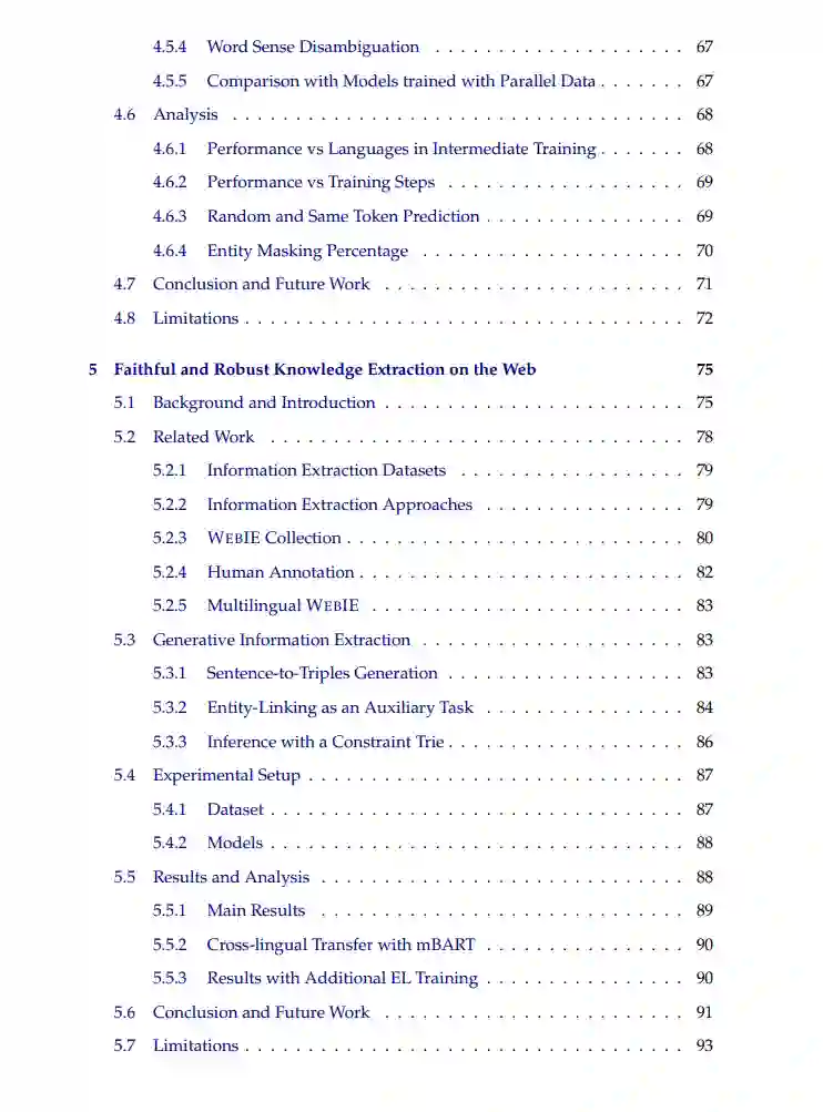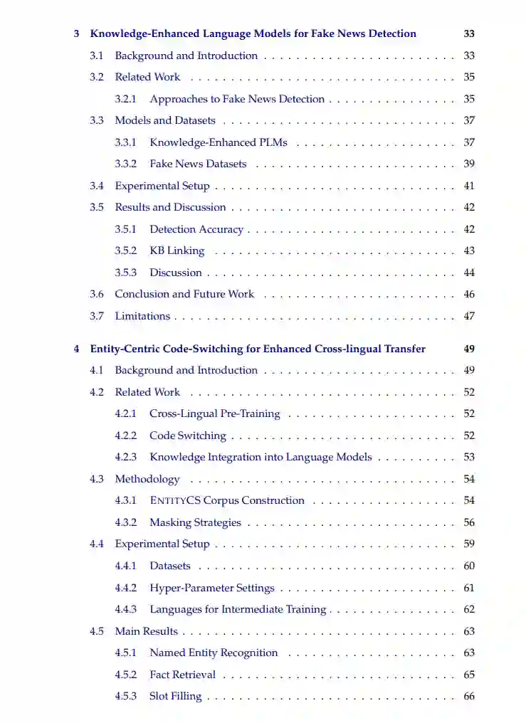 总结来说,本文探讨了在自然语言理解和生成中知识增强的作用,覆盖了广泛的任务。我们发现,结合相关且最新的实体知识有助于假新闻检测,并且针对实体中心任务的实体焦点代码切换显著增强了零样本跨语言转移。在有效且忠实地提取结构化知识方面,我们的研究发现,整合负面示例和使用实体规划训练显著提高了性能。此外,我们确定了其他一般形式的知识,如参数化和提炼知识,增强了多模态和多语言知识密集型任务。这项研究展示了多样化知识整合的实际好处,并激发了进一步探索这一方向的动机。
