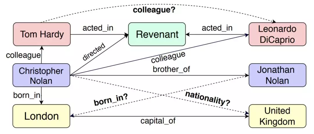 由于知识图谱本身就是一种图数据,因此知识图谱 +GNN 的组合自然就成了解决各类知识图谱问题的新手段。关系补全或预测问题是知识图谱的一大基础任务,通过关系的推理补全可以大大提升知识图谱的应用质量,下图给出了关系补全的一个实例: