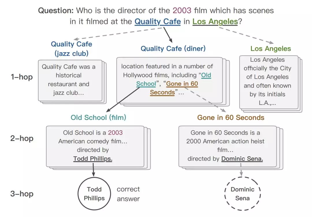 GNN 与 NLP 的结合,关键点也在于 GNN 优秀的推理能力。GNN 在一些场景如:阅读理解、实体识别与关系抽取、依存句法分析中都有应用。下面我们以多跳阅读(Multi-hop reading)为例,多跳阅读是说在阅读理解的过程中,往往需要在多篇文档之间进行多级跳跃式的关联与推理,才能找到正确答案,相比较以前的单文档问答数据集,这是一个更具有开放性与挑战性的推理任务。下图给出了多跳阅读的样例:
