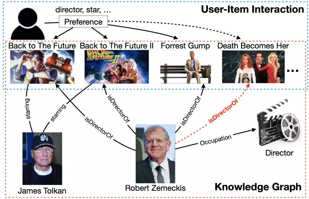 除了推荐系统算法模型本身的研究,另一种思路在于如何使推荐系统有效融合进额外的信息,如用户端社交网络的信息、商品端商品知识图谱的信息。这类信息中通常也蕴含了极强的关系,因此可以非常自然地与用户 - 商品二部图合在一起构成一个更大的异构图。下图给出了与电影知识图谱的结合示意图: