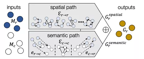 以上述构建的图为基础,使用GNN来进行推理,区域节点的特征来自卷积网络,实体节点的特征来自预训练的词向量。GNN推理是为了融合空间和语义信息对区域进行推理,因此使用了两条推理路径。一条是区域——区域,它聚合多个区域的特征以得到空间特征;另一条是区域——实体——实体,它分为两步,第一步将区域的特征聚合到实体节点并与实体节点特征融合,然后对不同类型的实体关系进行聚合得到实体的特征,这对应着语义关系。为了得到区域的最终特征,通过实体——区域的关系,将实体携带的语义特征聚合到区域节点上,并与第一条推理路径得到的空间特征进行融合。整个过程如下图所示。
